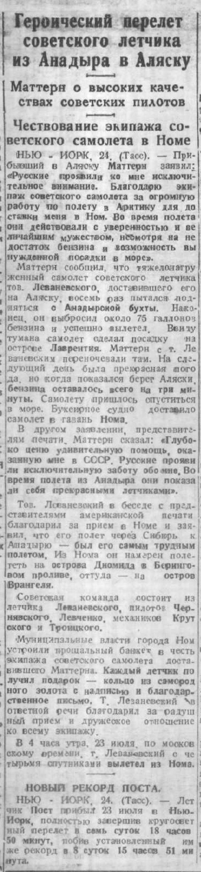 «НЬЮ - ЙОРК, 24, (Тасс). — Прибывший в Аляску Маттерн заявил: «Русские проявили ко мне исключительное внимание. Благодарю экипаж советского самолета за огромную работу по полету в Арктику для доставки меня в Ном. Во время полета они действовали с уверенностью и величайшим мужеством, несмотря на недостаток бензина и возможность вынужденной посадки в море».