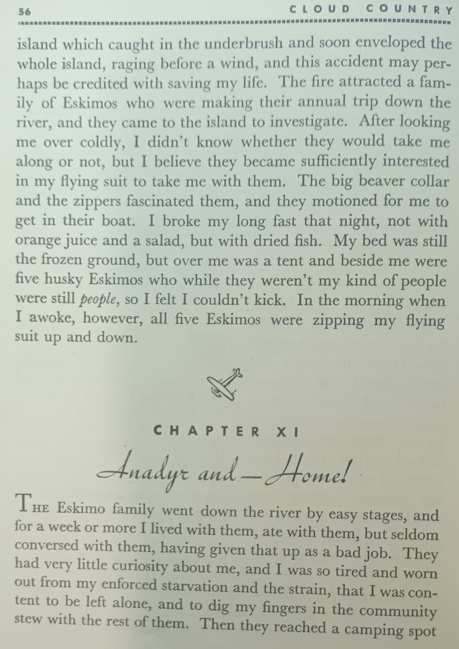 ... Then one day, my fourteenth day alone, I built a fire on the island which caught in the underbrush and soon enveloped the whole island, raging before a wind, and this accident may perhaps be credited with saving my life. The fire attracted a family of Eskimos who were making their annual trip down the river, and they came to the island to investigate. After looking me over coldly, I didn't know whether they would take me along or not, but I believe they became sufficiently interested in my flying suit to take me with them. The big beaver collar and the zippers fascinated them, and they motioned for me to get in their boat. I broke my long fast that night, not with orange juice and a salad, but with dried fish. My bed was still the frozen ground, but over me was a tent and beside me were five husky Eskimos who while they weren't my kind of people were still people, so I felt I couldn't kick. In the morning when I awoke, however, all five Eskimos were zipping my flying suit up and down.