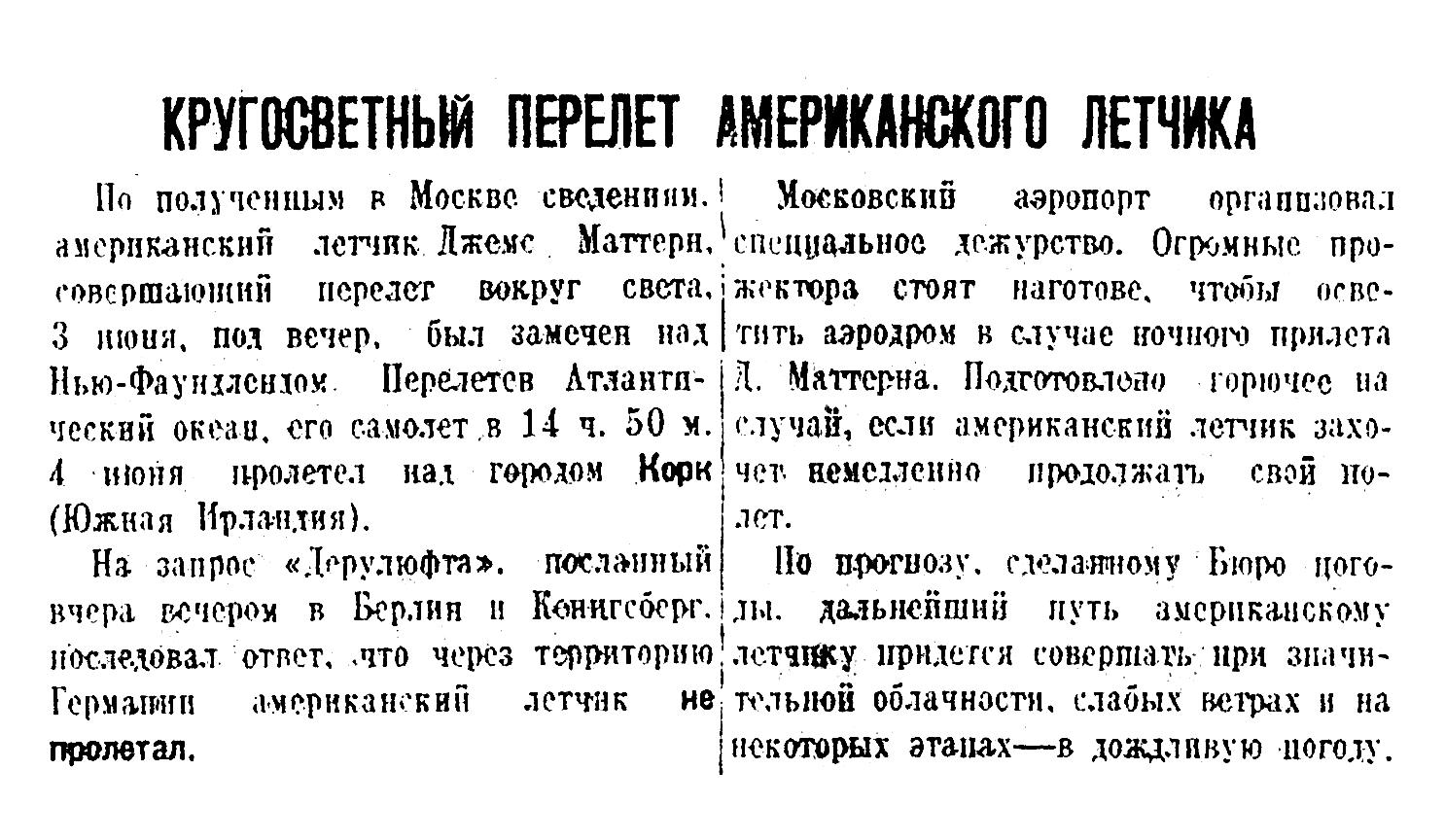 Совершающий кругосветный перелет американский летчик Маттерн прилетел в Москву и снизился на аэродроме аэропорта вчера, 5 июня, в 4 часа дня по московскому времени. На аэродроме он был встречен представителями Аэрофлота, летчиками, советскими и иностранными журналистами. От имени Главного управления гражданского воздушного флота Маттерна приветствовал помощник начальника главной инспекции аэрофлота т. Гончаров.