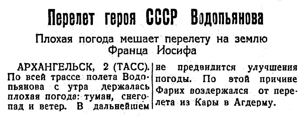 Завтра у трок намечается старт самолета «Г-1» под управлением летчика-краснознаменца тов. Ф. Б. Фариха, который полетит по маршруту: Москва — Архангельск — Усть-Цыльма — Амдерма — бухта Варнека остров Вайгач. Команду самолета составляют: штурман-радист т. Зибрев, первый бортмеханик т. Чагин и второй бортмеханик т. Демидов.