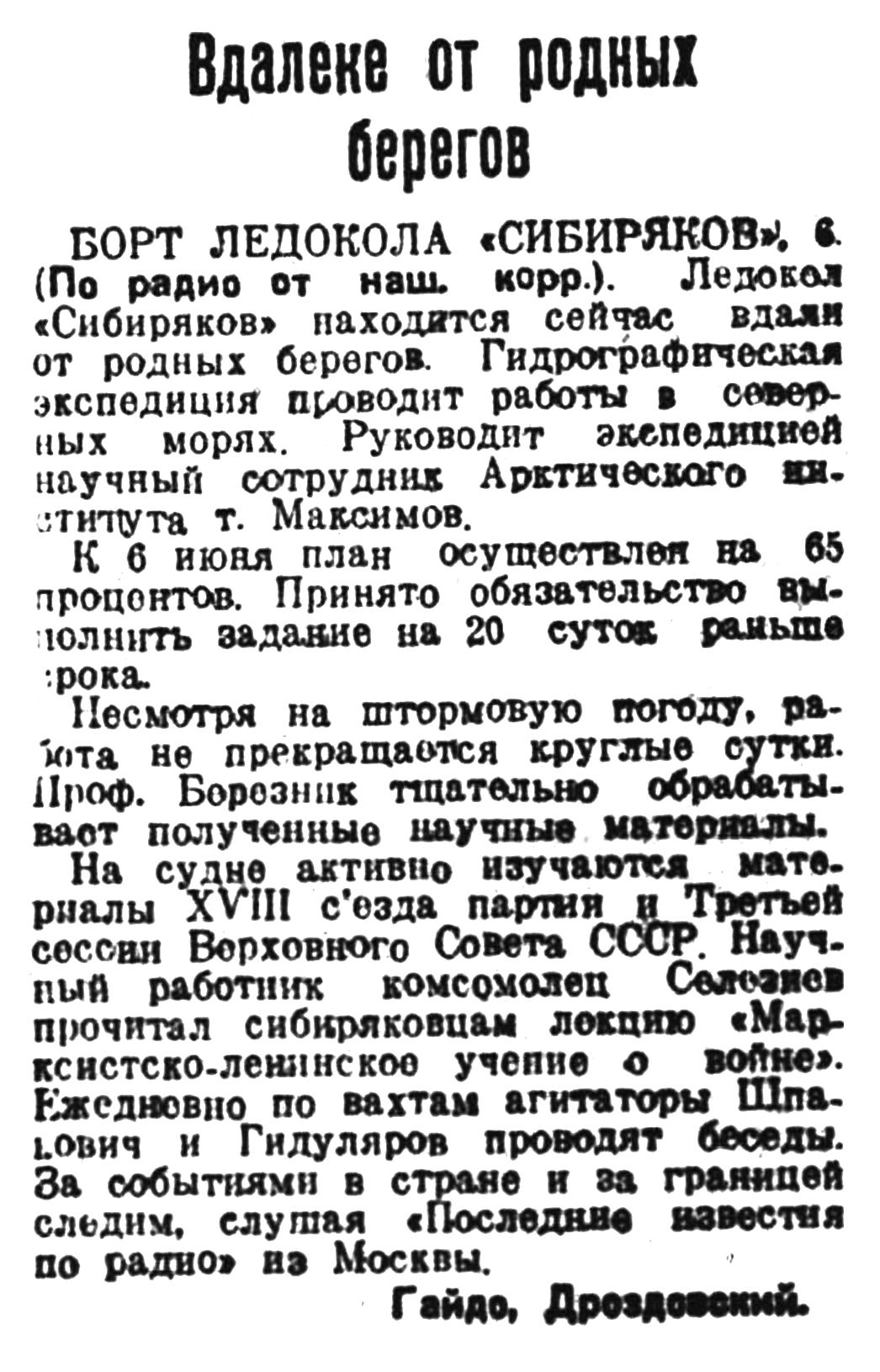 Много радости доставили нам свежие газеты, полученные с «Дежнева». С особенным вниманием читаем доклад тов. Молотова на внеочередной Четвертой сессии Верховного Совета СССР.