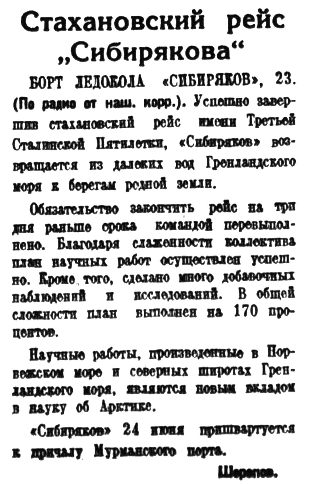 БОРТ ЛЕДОКОЛА «СИБИРЯКОВ», 10. (По радио). Научные гидрологические работы, производящиеся экспедицией Главсевморпути на краснознаменном ледоколе «Сибиряков» в районе Норвежского и Гренландского морей, идут успешно. Рейс объявлен стахановским имени Третьей Сталинской Пятилетки.