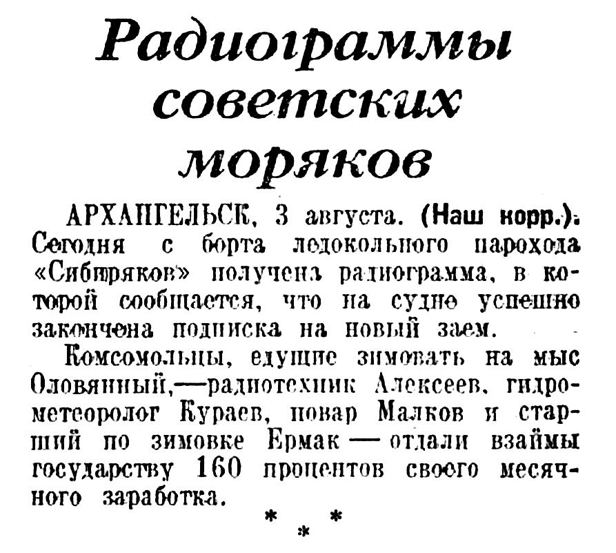 БОРТ «СИБИРЯКОВА», 4. (По радио от нашего спец. корр.). Наш радист Дроздовский на ночной вахте принял сообщение о выпуске нового займа. На ледоколе состоялось собрание команды совместно с пассажирами. После разъяснительной работы началась подписка.