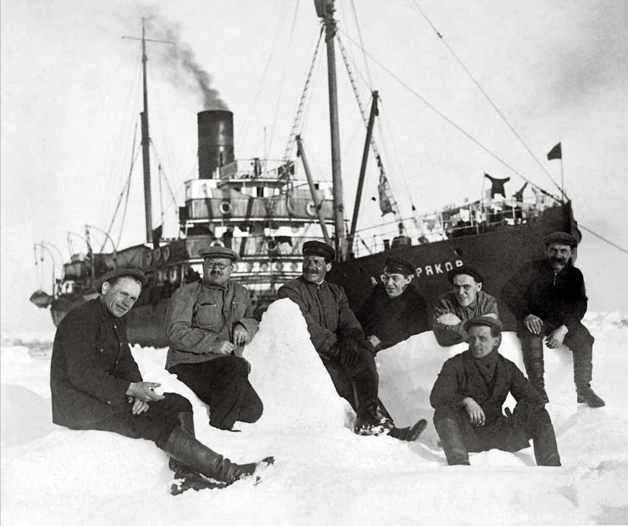 Участники арктической экспедиции ледокольного парохода «А. Сибиряков» на припае Печорского моря. В центре — легендарный капитан В. И. Воронин.