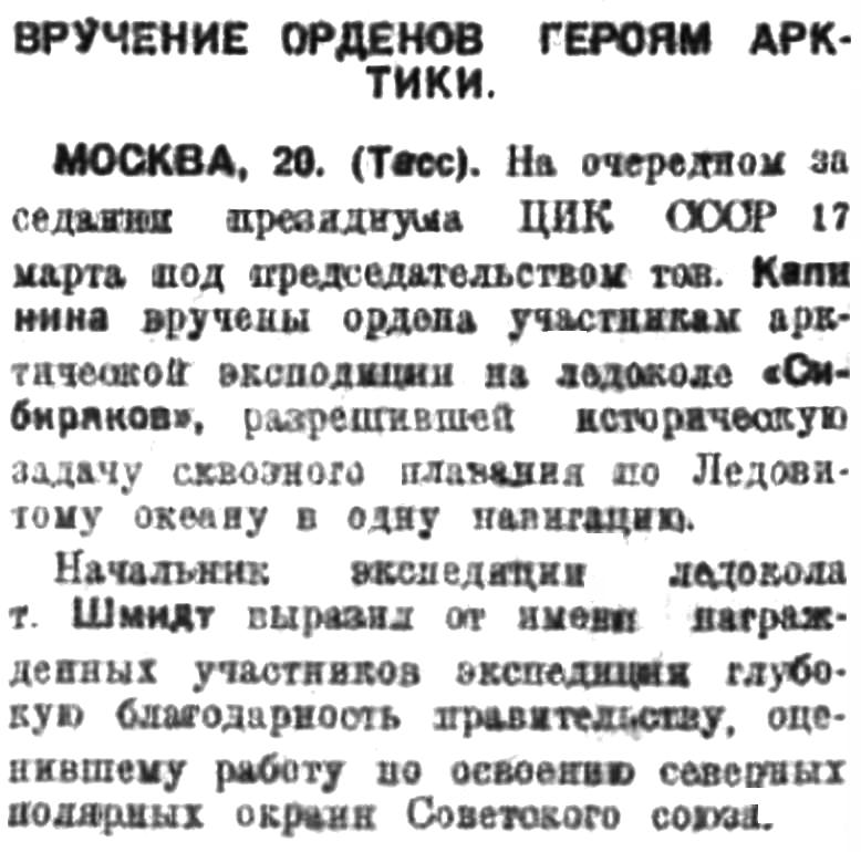 МОСКВА, 20. (Тасс). На очередном заседании президиума ЦИК СССР 17 марта под председательством тов. Калинина вручены ордена участникам арктической экспедиции на ледоколе «Сибиряков», разрешившей историческую задачу сквозного плавания по Ледовитому океану в одну навигацию.