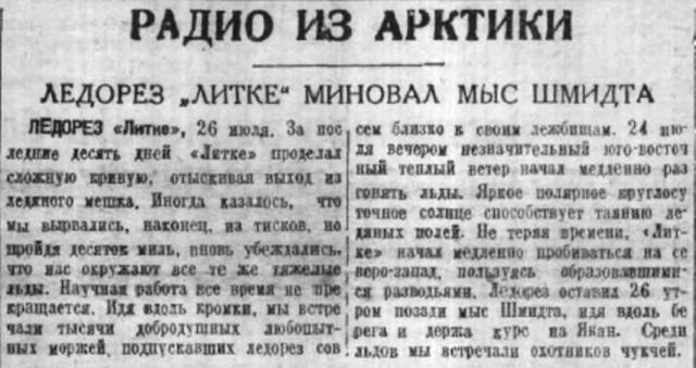 БОРТ «ЛИТКЕ». 7 (ТАСС). Утром ледорез «Литке» вошел в Авачинскую бухту, откуда хорошо видев Петропавловск. Показывается краснознаменный ледокол «Красин», который приветствует «Литке» флагами.
