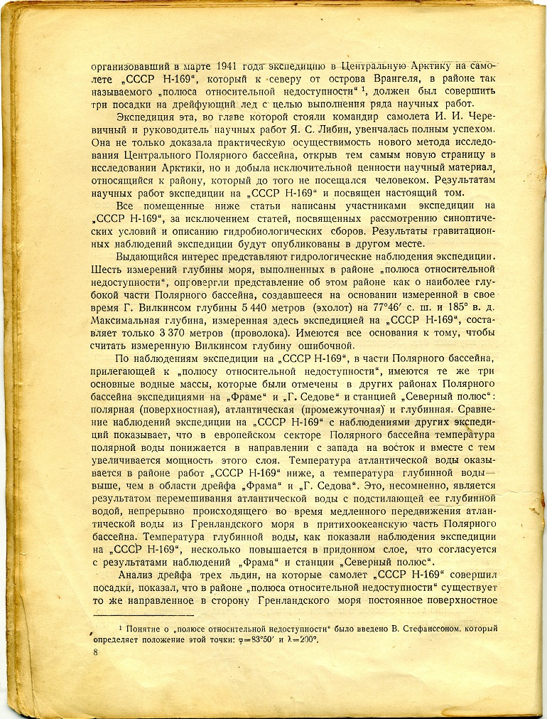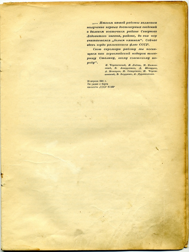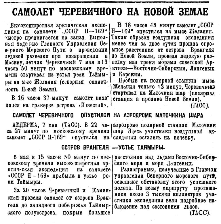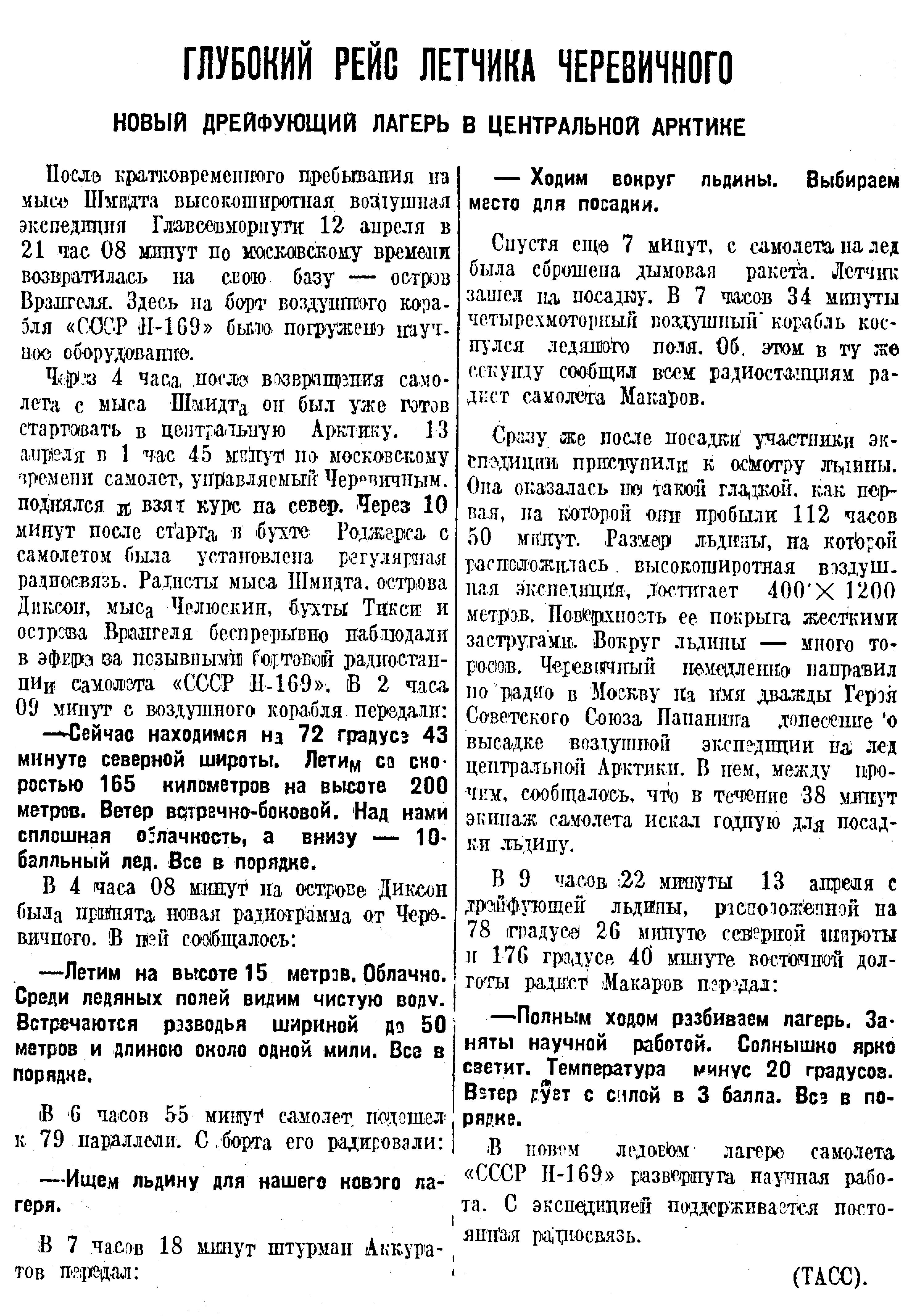 (Прим. Каминский М.Н.)САМОЛЕТ И. И. ЧЕРЕВИЧНОГО ПОКИНУЛ ЛЕДОВЫЙ ЛАГЕРЬ7 апреля вечером в Главном управлении Северного морского пути была получена радиограмма, в которой сообщалось, что самолет «СССР Н—169». пилотируемый летчиком И. И. Черевичным, покинул свой ледовый лагерь. В радиограмме, принятой с борта самолета, тт. Черевичный и Либин передали: