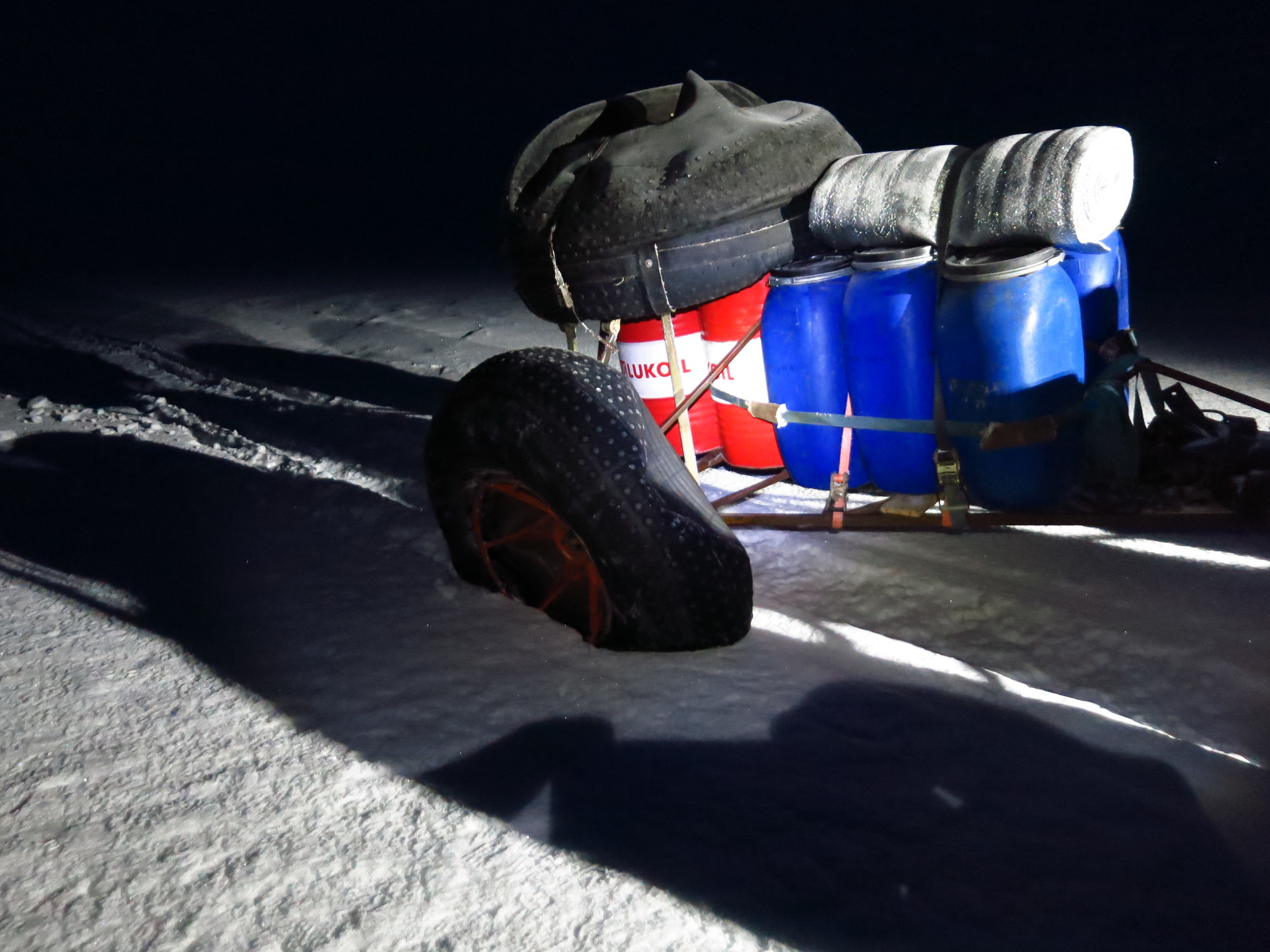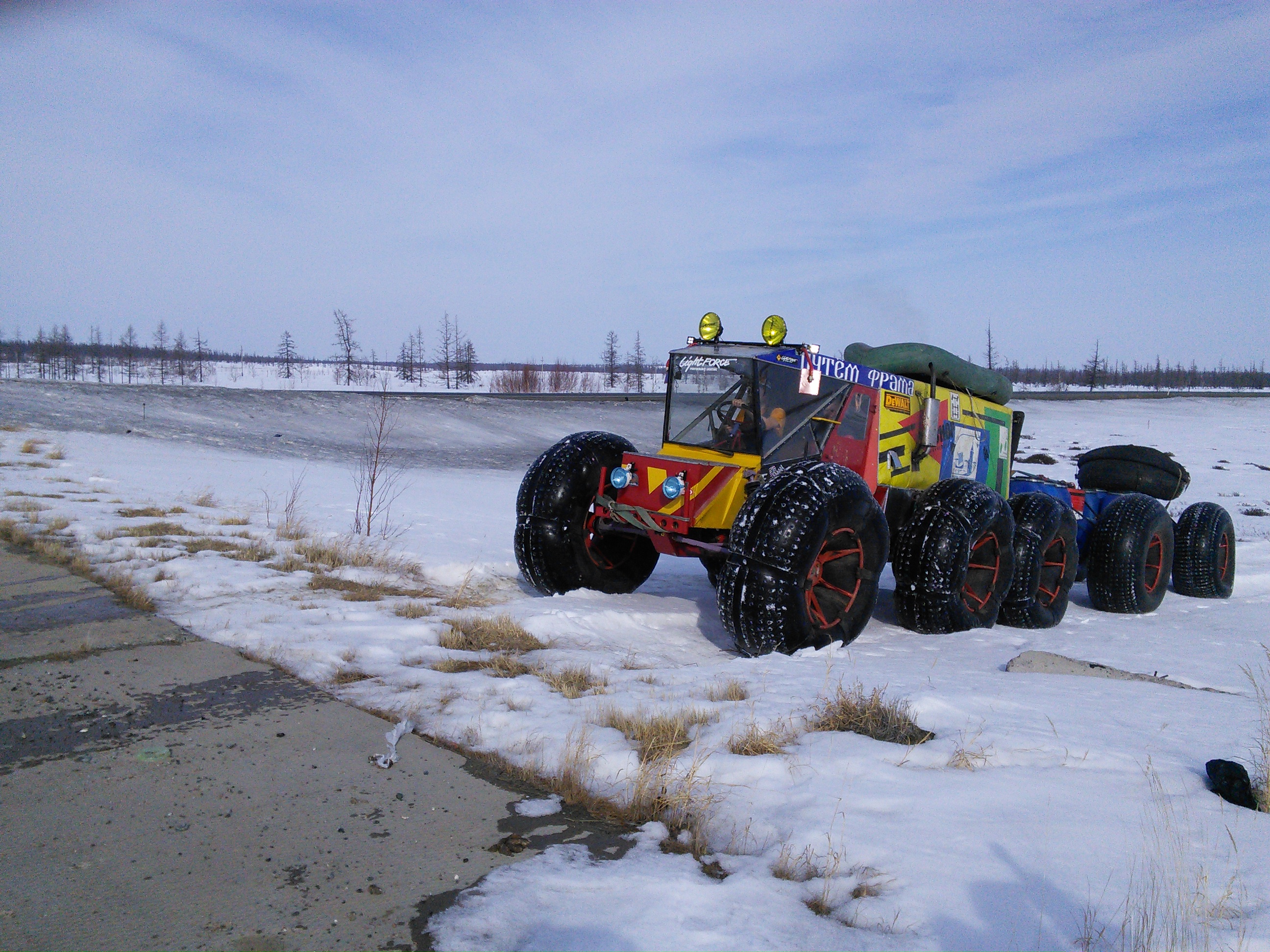 Произошла масса интереснейших событий, начиная с того, что при форсировании ледовой переправы через реку Пур к Уренгою, нагрузки на прицеп добили его ходовую и пройдя еще несколько километров по трассе, ось прицепа отломилась вместе с колесом. В приближающейся ночи кипела работа по замене колеса на кусок березы, отпиленной в лесу бензопилой, как бы случайно оказавшейся у нас в кузове :)