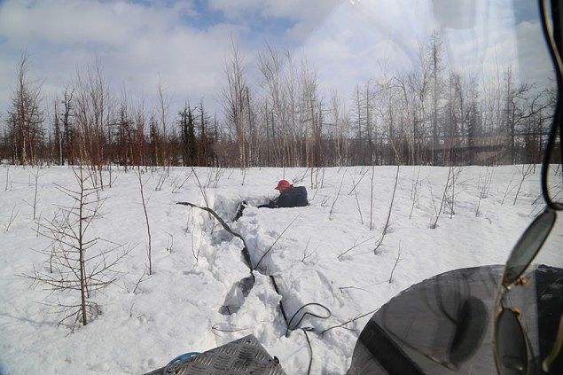 12:45 Старт самолета, 12:55 вездехода. Самолет прикуривали. Река вся в следах, как минимум, трех зверей. Прыжок вездехода с обрыва в полтора метра. В какой-то момент "зимник" разошелся несколькими занесенными колеями по тундре, мы пошли по колее от гусеничного вездехода, которая шла по пологому спуску, и было видно, что продолжалась дальше, но прервалась вдруг полутораметровым обрывом... Ремонт прицепа, который сложился.