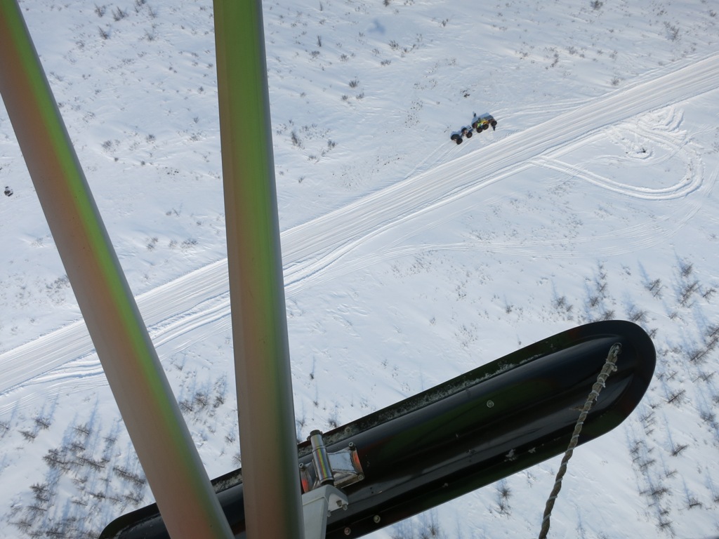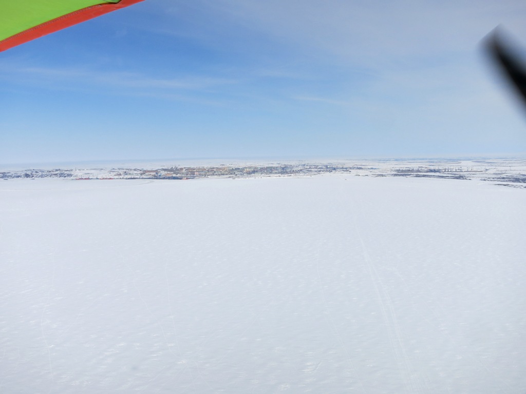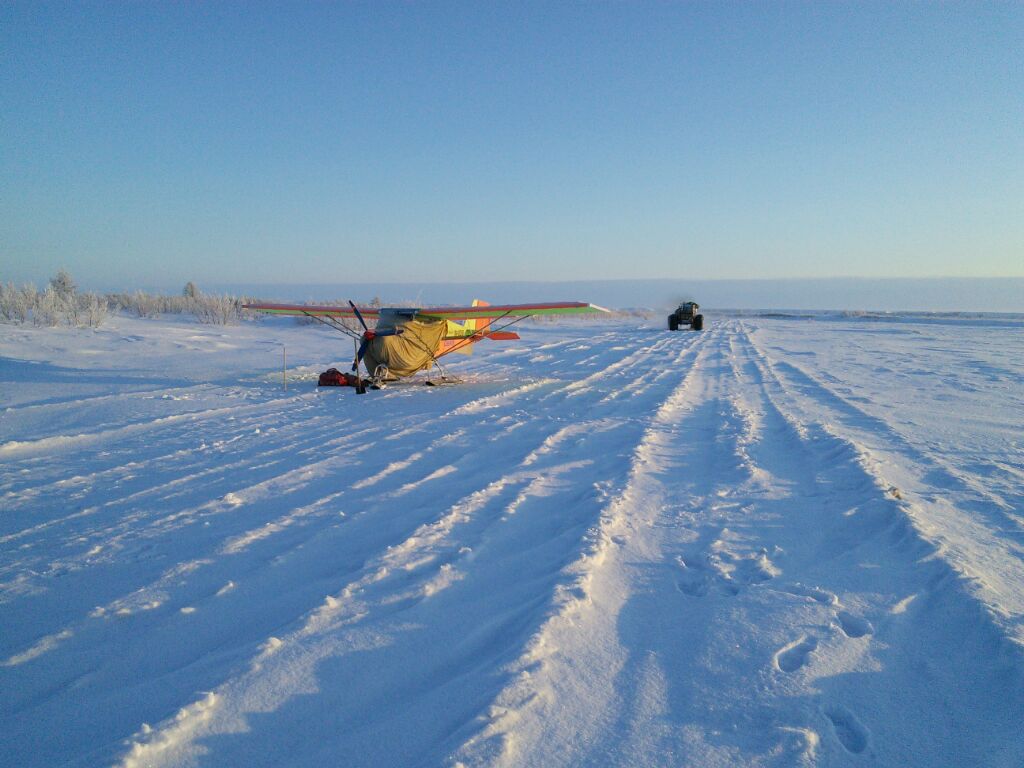 Итак, в воскресенье в Пасху уже ближе к вечеру произвел первый вылет с участка наста, протоптанного мне вездеходом. Оказалось, что величины ограничительных тросов, хода лыжи самолета, в Подмосковье и Ямале сильно разнятся