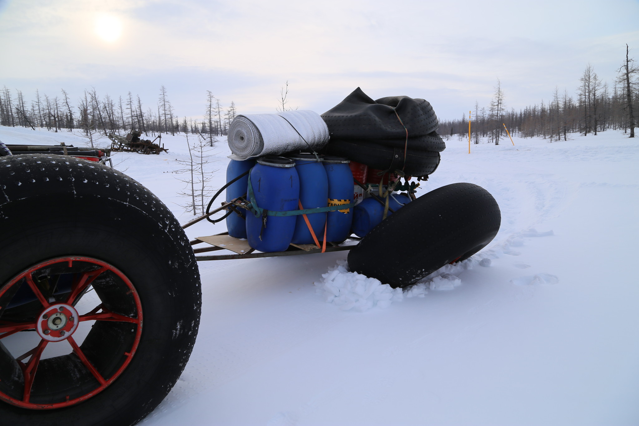 Ну а теперь, приводим технику в порядок. На вездеходе заклеили протертое при перевозке с Большой Земли колесо, загрузили прицепы вещами и топливом. Вчера поздно ночью прошел успешно пробный выезд с максимальной нагрузкой, хотя поначалу несколько раз срывало трубку обратки топлива из-за повышенного давления.Нашли место, где шланг оказался пережат баком, опять таки во время перевозки.