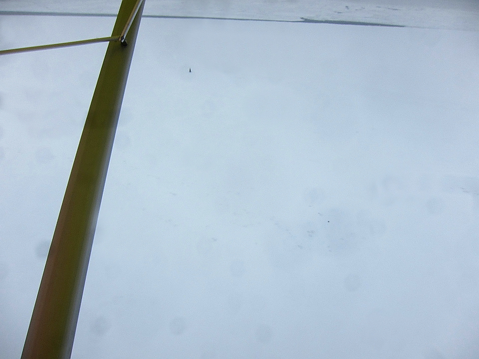 Сел в тихую бухточку и подрулил к еле заметному выступу из снега на северном берегу. От балка одна труба видна из снега. Глушусь.