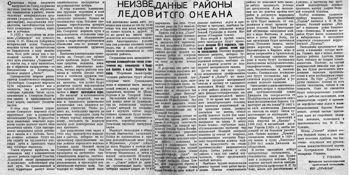 Идем далее. Берем в руки статью Г. А. Ушакова "Неизведанные районы Ледовитого океана", напечатанной в "Правде Ц. О.", 1 апреля 1935 г. (я выложил сюда ее перепечатку в "Полярной правде" 5 апреля 1935 г.) В статье довольно развернуто описываются планы экспедиции. Но экспедиция планируется на л.п. "Г. Седов"! Читаем беседу с О. Ю. Шмидтом "Арктика в 1935 г." в "Полярной Правде" от 6 апреля, и вновь : "Развитие грузовых операций требует от нас дальнейшего исследования Ледовитого океана. Для этой цели отпраляется специальная научная экспедиция на ледокольном пароходе "Седов" под начальством Г. А. Ушакова."