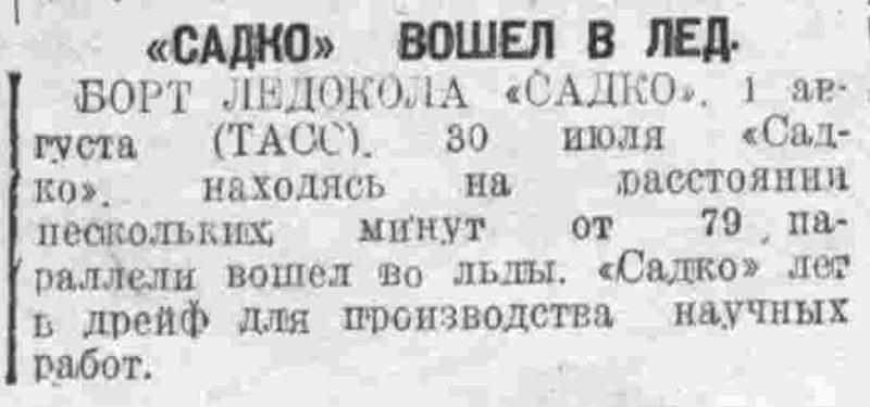 Борт ледокола «Садко». 1 августа (ТАСС). 30 июля «Садко». находясь на расстоянии нескольких минут от 79 параллели вошел во льды. «Садко» лег в дрейф для производства научных работ.