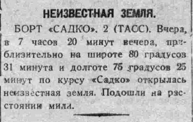 БОРТ «САДКО». 2 (ТАСС). Вчера, в 7 часов 20 минут вечера, приблизительно на широте 80 градусов 31 минута и долготе 75 градусов 25 минут по курсу «Садко» открылась неизвестная земля. Подошли на расстоянии мили.