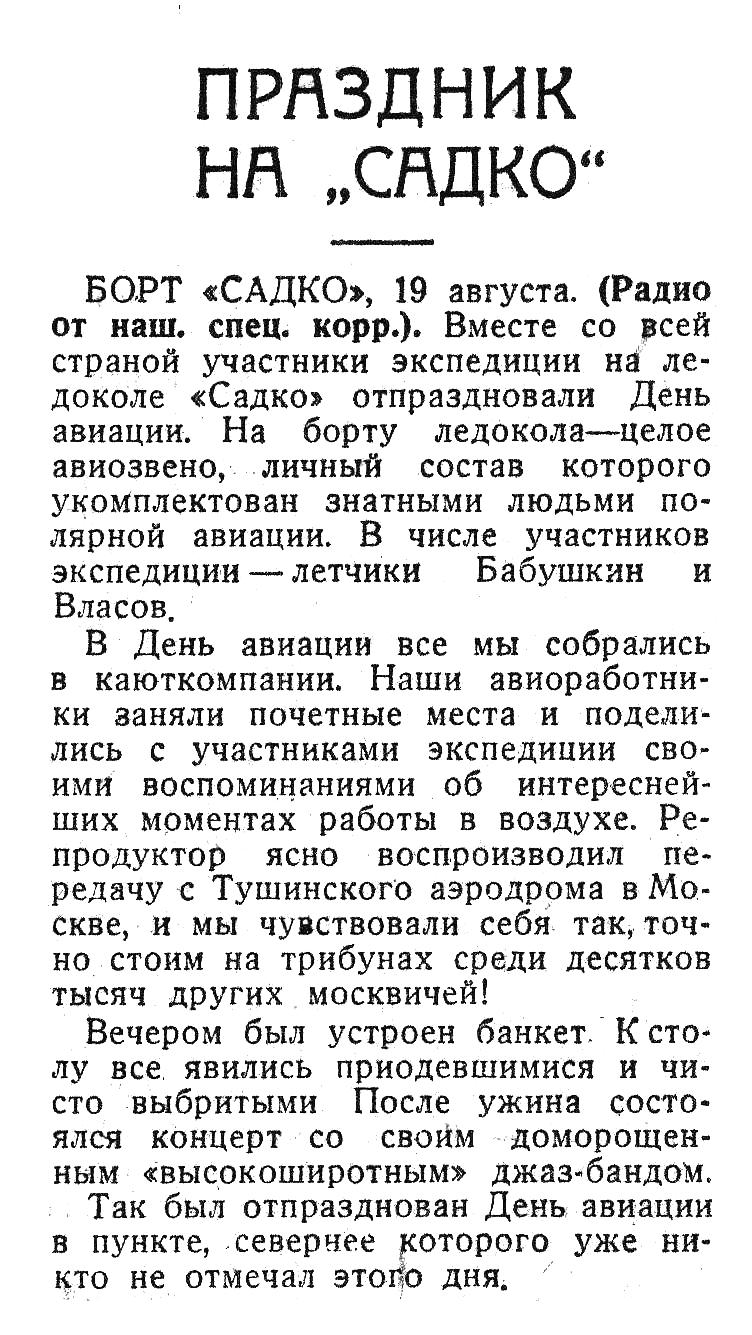 БОРТ «САДКО», 19 августа. (Радио от наш. спец. корр.). Вместе со всей страной участники экспедиции на ледоколе «Садко» отпраздновали День авиации. На борту ледокола — целое авиозвено, личный состав которого укомплектован знатными людьми полярной авиации. В числе участников экспедиции — летчики Бабушкин и Власов.