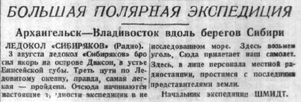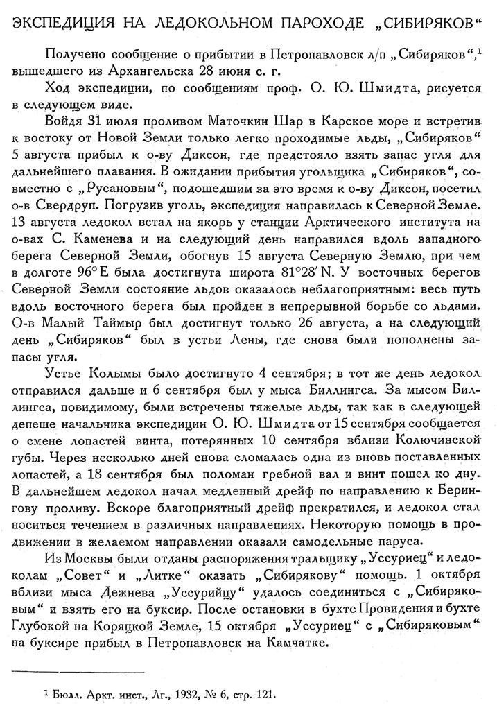 ЭКСПЕДИЦИЯ АРКТИЧЕСКОГО ИНСТИТУТА для исследования водного пути Архангельск — Владивосток на л/п „Сибиряков", под начальством проф. О. Ю. Шмидта, вышла из Архангельска 26 июля с. г. Через три дня после отхода этой экспедиции на л/п „Русанов“ отправилась экспедиция, под начальством проф. Р. Л. Самойловича, для организации новой станции Международного полярного года на мысе Челюскине и (для смены зимовщиков Северной Земли.