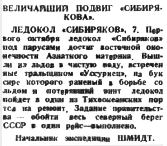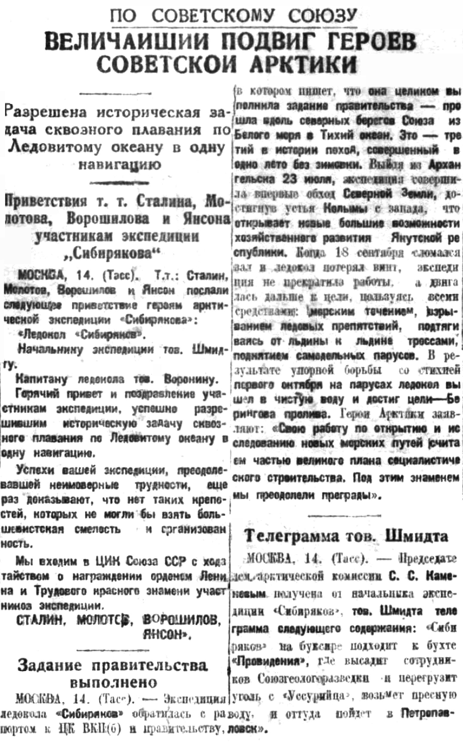 Начальником экспедиции О. Ю. Шмидтом получена следующая телеграмма, адресованная ему и капитану ледокола Воронину и подписанная тт. Сталиным, Молотовым, Ворошиловым и Янсоном: „Горячий привет и поздравление участникам экспедиции, успешно разрешившим историческую задачу сквозного плавания по Ледовитому океану в одну навигацию. Успехи вашей экспедиции, преодолевшей неимоверные трудности, еще раз доказывают, что нет таких крепостей, которых не могли бы взять большевистская смелость и организованность. Мы входим в ЦИК Союза ССР с ходатайством о награждении орденом Ленина и Трудового знамени участников экспедиции“.