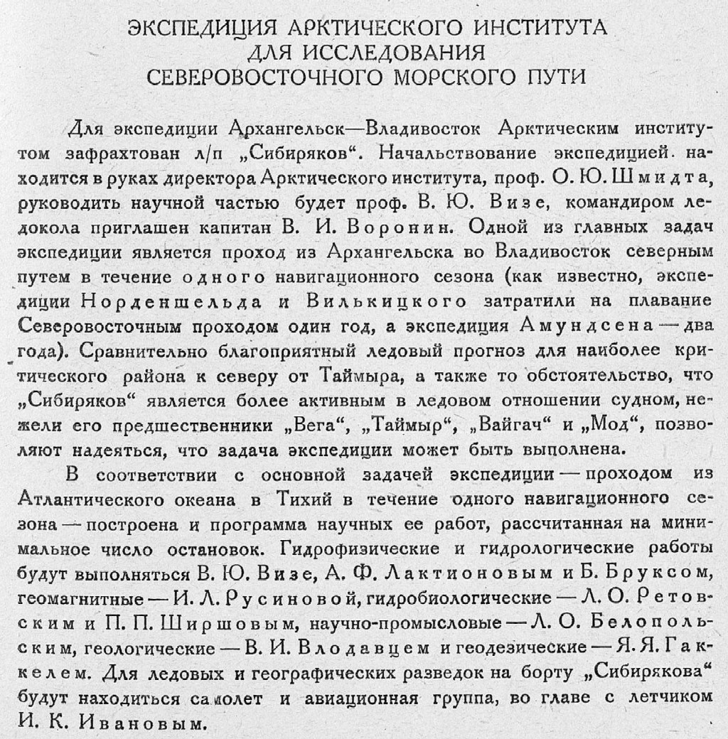 Для экспедиции Архангельск — Владивосток Арктическим институтом зафрахтован л/п „Сибиряков". Начальствование экспедицией, находится в руках директора Арктического института, проф. О. Ю. Шмидта, руководить научной частью будет проф. В. Ю. Визе, командиром ледокола приглашен капитан В. И. Воронин. Одной из главных задач экспедиции является проход из Архангельска во Владивосток северным путем в течение одного навигационного сезона (как известно, экспедиции Норденшельда и Вилькицкого затратили на плавание Северовосточным проходом один год, а экспедиция Амундсена — два года). Сравнительно благоприятный ледовый прогноз для наиболее критического района к северу от Таймыра, а также то обстоятельство, что „Сибиряков" является более активным в ледовом отношении судном, нежели его предшественники „Вега", „Таймыр", „Вайгач" и „Мод", позволяют надеяться, что задача экспедиции может быть выполнена.