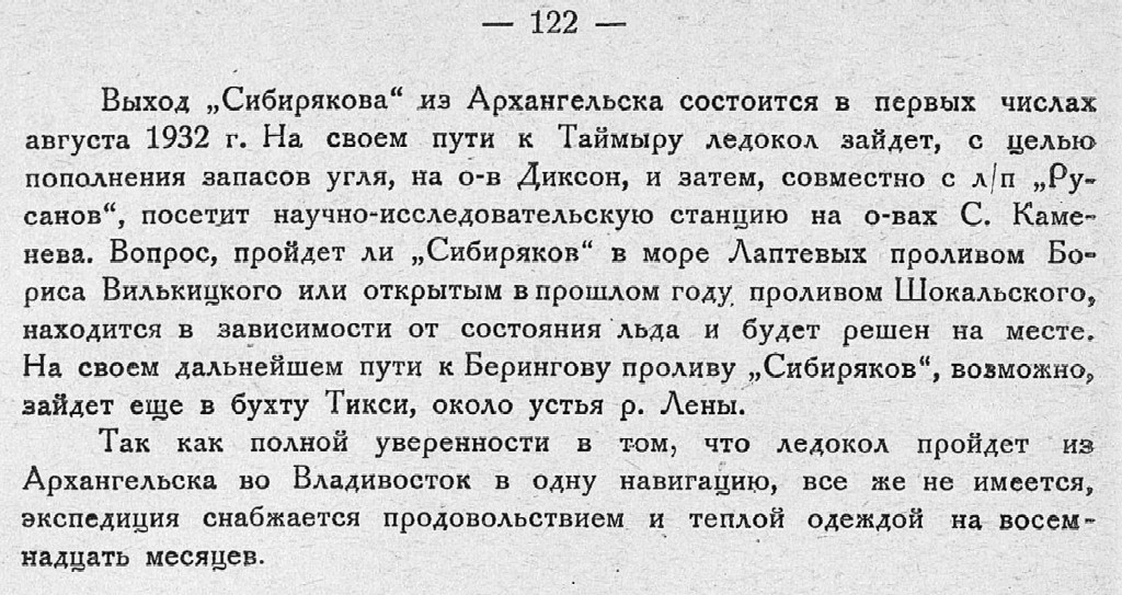 Выход „Сибирякова" из Архангельска состоится в первых числах августа 1932 г. На своем пути к Таймыру ледокол зайдет, с целью пополнения запасов угля, на о-в Диксон, и затем, совместно с л/п „Русанов“, посетит научно-исследовательскую станцию на о-вах С. Каменева. Вопрос, пройдет ли „Сибиряков" в море Лаптевых проливом Бориса Вилькицкого или открытым в прошлом году проливом Шокальского, находится в зависимости от состояния льда и будет решен на месте. На своем дальнейшем пути к Берингову проливу „Сибиряков”, возможно, зайдет еще в бухту Тикси, около устья р. Лены.