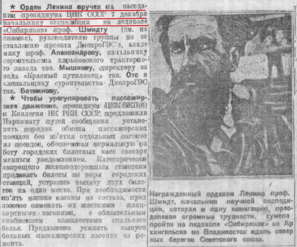 Орден Ленина вручен на заседании президиума ЦИК СССР 7 декабря начальнику экспедиции на ледоколе "Сибиряков" проф. Шмидту (см. на снимке).