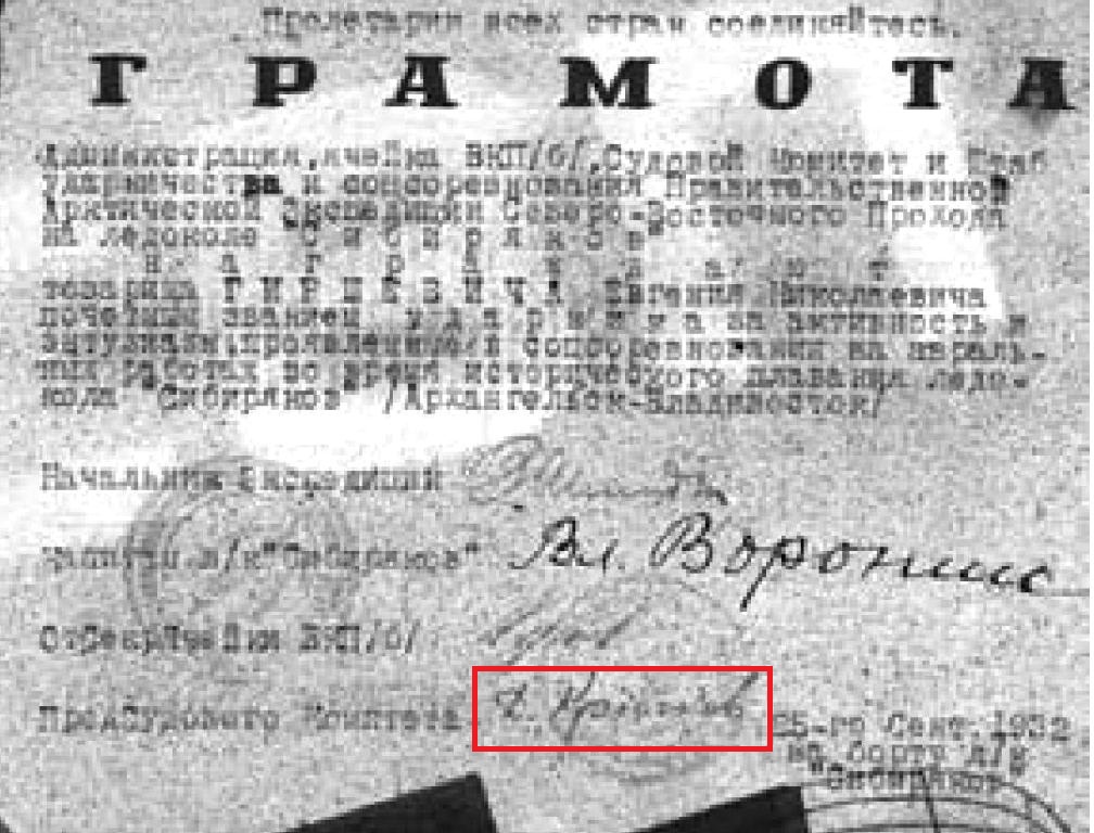 Однако на приведенном в той же статье изображении грамоты о награждении Гиршевича отчетливо видна подпись предсудкома Д. Крючков.