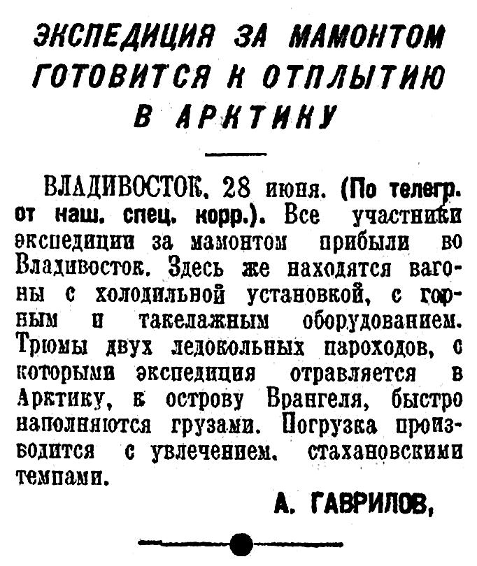 ВЛАДИВОСТОК, 28 июня. (По телегр. от наш. спец. корр.). Все участники экспедиции за мамонтом прибыли во Владивосток. Здесь же находятся вагоны с холодильной установкой, с горным и такелажным оборудованием. Трюмы двух ледокольных пароходов, с которыми экспедиция отравляется в Арктику, в острову Врангеля, быстро наполняются грузами. Погрузка производится с увлечением, стахановскими темпами.