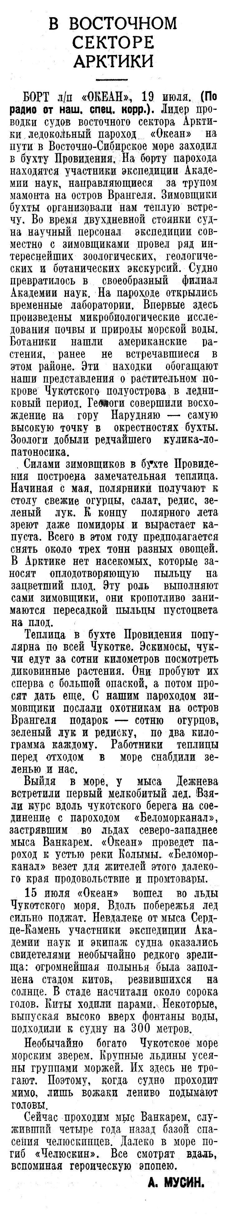БОРТ л/п «ОКЕАН», 19 июля. (По радио от наш. спец. корр.). Лидер проводки судов восточного сектора Арктики ледокольный пароход «Океан» на пути в Восточно-Сибирское море заходил в бухту Провидения. На борту парохода находятся участники экспедиции Академии наук, направляющиеся за трупом мамонта на остров Врангеля. Зимовщики бухты организовали нам теплую встречу. Во время двухдневной стоянки судна научный персонал экспедиции совместно с зимовщиками провел ряд интереснейших зоологических, геологических и ботанических экскурсий. Судно превратилось в своеобразный филиал Академии наук. На пароходе открылись временные лаборатории. Впервые здесь произведены микробиологические исследования почвы и природы морской воды. Ботаники нашли американские растения, ранее не встречавшиеся в этом районе. Эти находки обогащают наши представления о растительном покрове Чукотского полуострова в ледниковый период. Геологи совершили восхождение на гору Нарудняю — самую высокую точку в окрестностях бухты. Зоологи добыли редчайшего кулика-лопатоносика.
