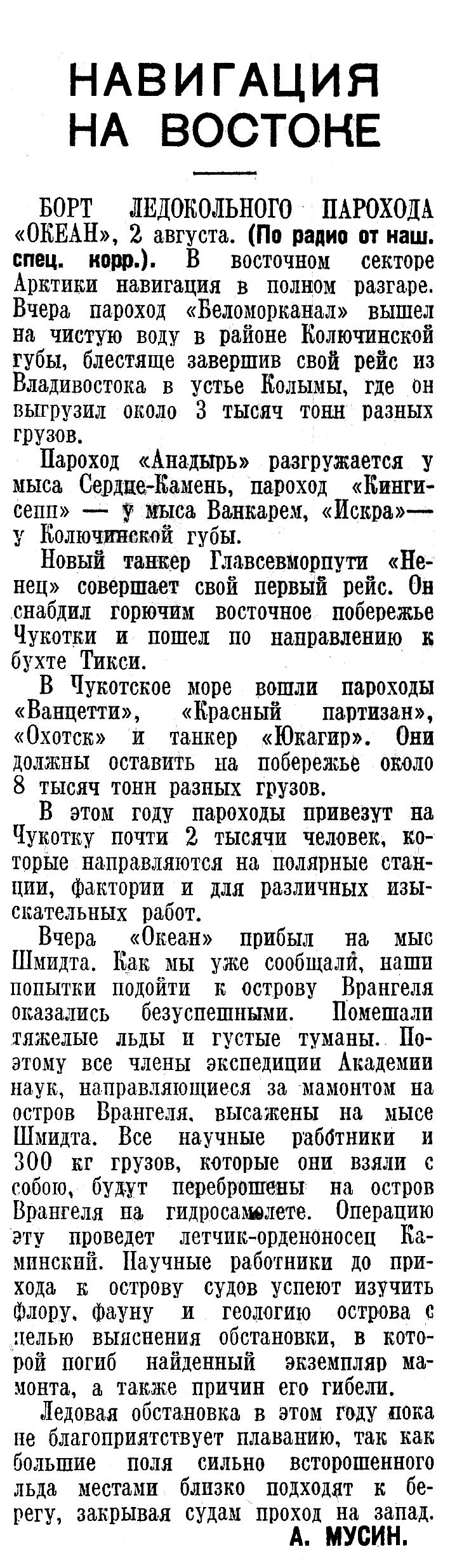 БОРТ ЛЕДОКОЛЬНОГО ПАРОХОДА «ОКЕАН», 2 августа. (По радио от наш. спец. корр.). В восточном секторе Арктики навигация в полном разгаре. Вчера пароход «Беломорканал» вышел на чистую воду в районе Колючинской губы, блестяще завершив свой рейс из Владивостока в устье Колымы, где он выгрузил около 3 тысяч тонн разных грузов.