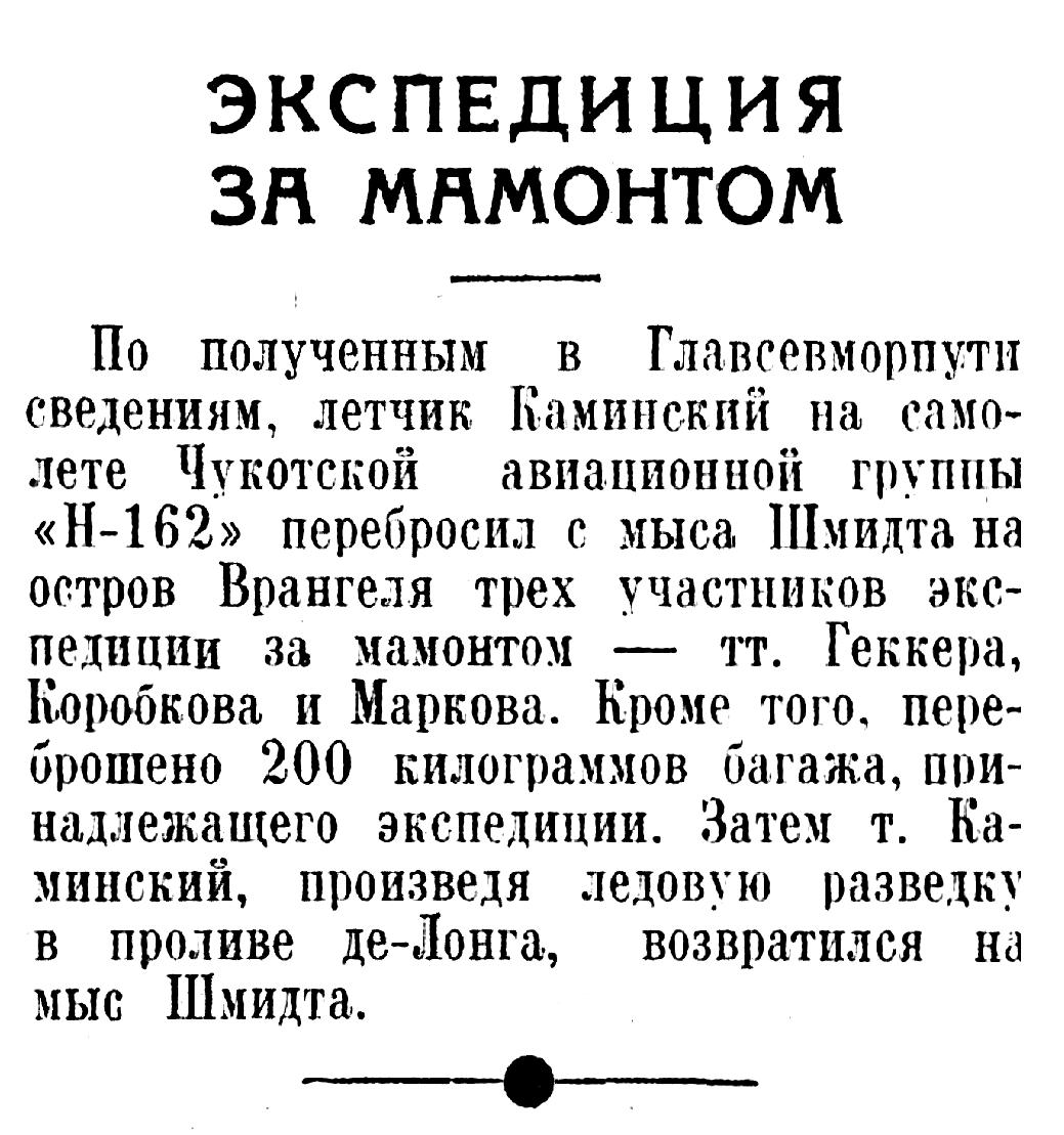 По полученным в Главсевморпути сведениям, летчик Каминский на самолете Чукотской авиационной группы «Н-162» перебросил с мыса Шмидта на остров Врангеля трех участников экспедиции за мамонтом — тт. Геккера, Коробкова и Маркова. Кроме того, переброшено 200 килограммов багажа, принадлежащего экспедиции. Затем т. Каминский, произведя ледовую разведку в проливе де-Лонга, возвратился на мыс Шмидта.