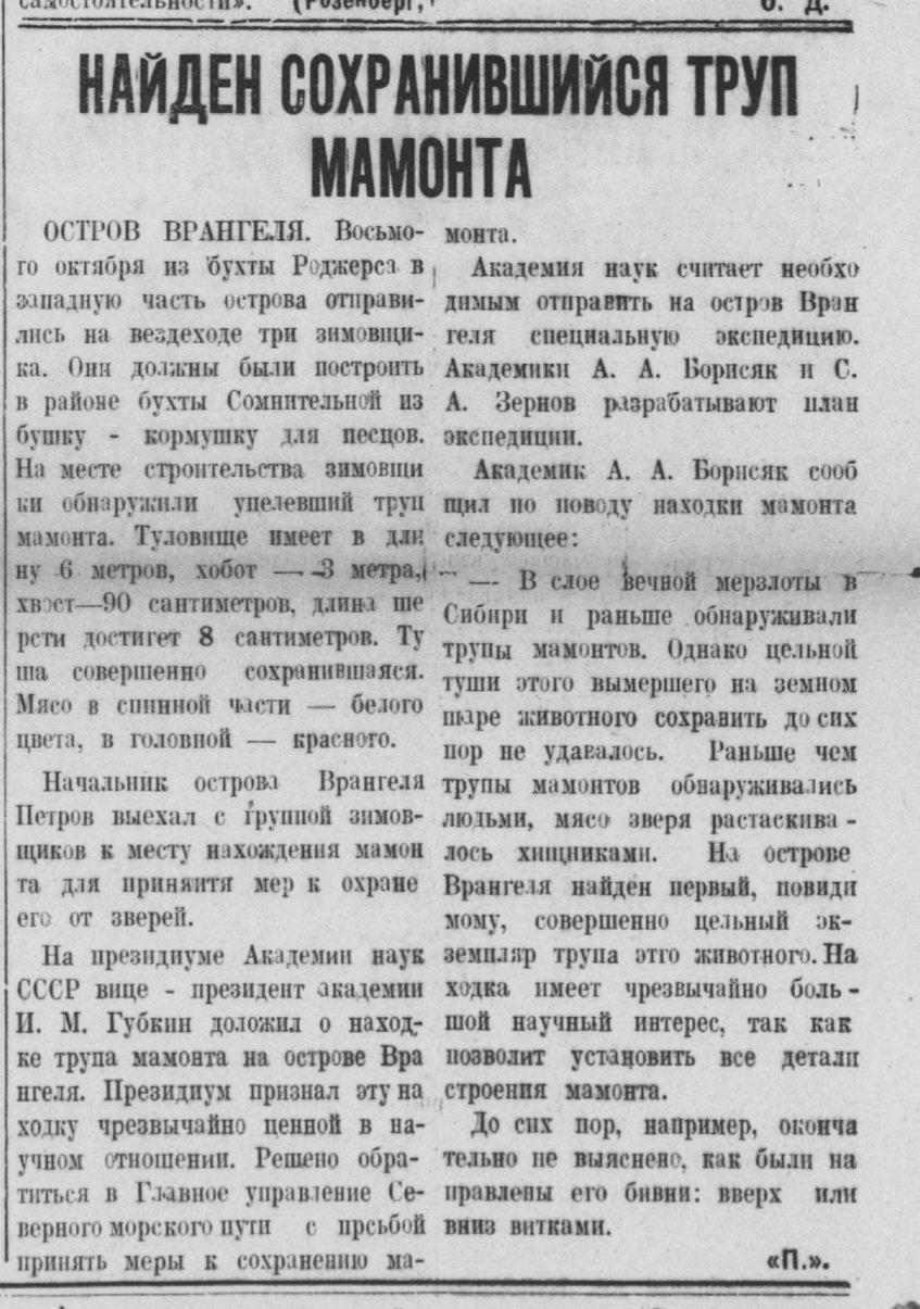 Найден сохранившийся труп мамонт //Рассвет,10 ноября 1937 г.
