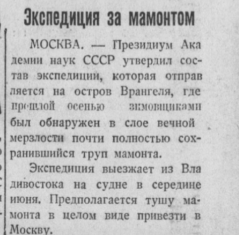 Вчера «Океан» прибыл на мыс Шмидта. Как мы уже сообщали, наши попытки подойти к острову Врангеля оказались безуспешными. Помешали тяжелые льды и густые туманы. Поэтому все члены экспедиции Академии наук, направляющиеся за мамонтом на остров Врангеля, высажены на мысе Шмидта. Все научные работники и 300 кг грузов, которые они взяли с собою, будут переброшены на остров Врангеля на гидросамолете. Операцию эту проведет летчик-орденоносец Каминский. Научные работники до прихода к острову судов успеют изучить флору, фауну и геологию острова с целью выяснения обстановки, в которой погиб найденный экземпляр мамонта, а также причин его гибели.