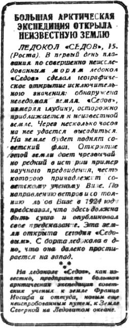 ЛЕДОКОЛ "СЕДОВ", 15. (Роста). В первый день плавания по совершенно неисследованным морям ледокол "Седов" сделал географическое открытие исключительною значения: обнаружена неведомая земля. "Седов", измеряя глубину, осторожно приближается к неизвестной земле. Через несколько часов на нее удастся высадиться. На земле будет поднят советский флаг. Открытие этой земли дает чрезвычайно редкий в истории пример научною предвидения, честь которою принадлежит советскому ученому Визе. По направлению ветров и состоянию льдов Визе в 1924 году предсказал, что здесь должна быть суша и опубликовал свае предсказание. Эта земля открыта сегодня "Седовым". С борта ледокола видно, что она далеко простирается на запад.