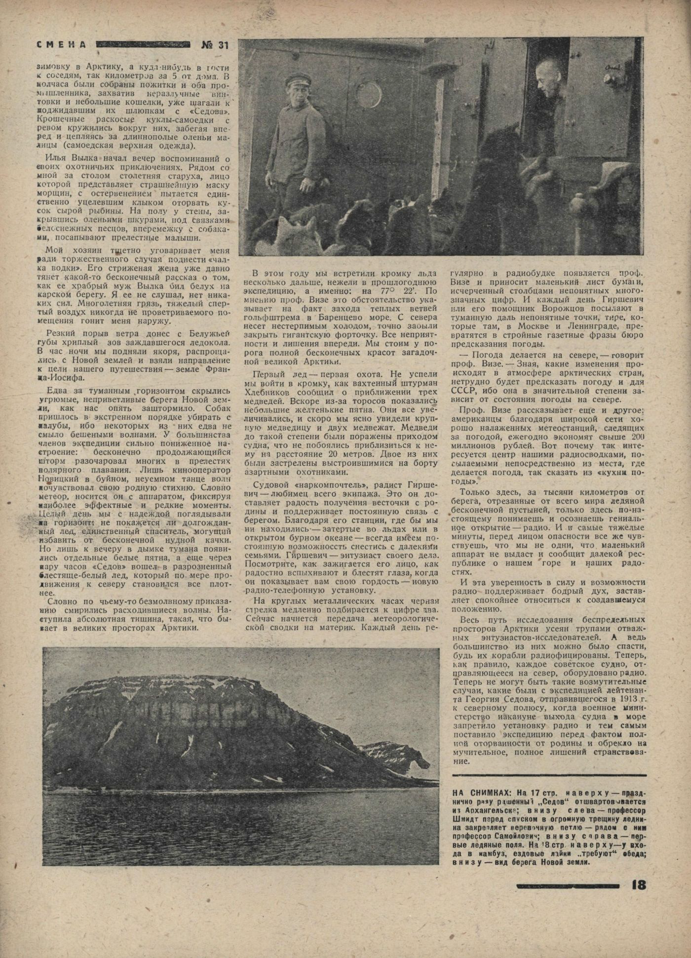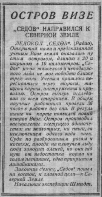 ЛЕДОКОЛ "СЕДОВ". (Радио). Открытая нами и предсказанная ученым Визе земля оказалась пустым островом, длиною в 20 и шириною в 10 километров. "Седов" из-за тяжелого и неподвижного льда не мог подойти ближе трех миль. Ученым пришлось перебираться через торосы, тащить нарты, инструменты и провизию. Остров теперь исследован со всем старанием. В общем научные работники провели 36 часов в работе без сна. В результате на карте появился новый остров Визе. Остров производил впечатление гнетущего одиночества: ни животных, ни птиц, за исключением одного вида чаек. Судя по разбросанным рогам и костям, иногда на пловучем льду сюда заносит оленей, но они гибнут от недостатка корма на голом песчанике, едва прикрытом лишайниками.