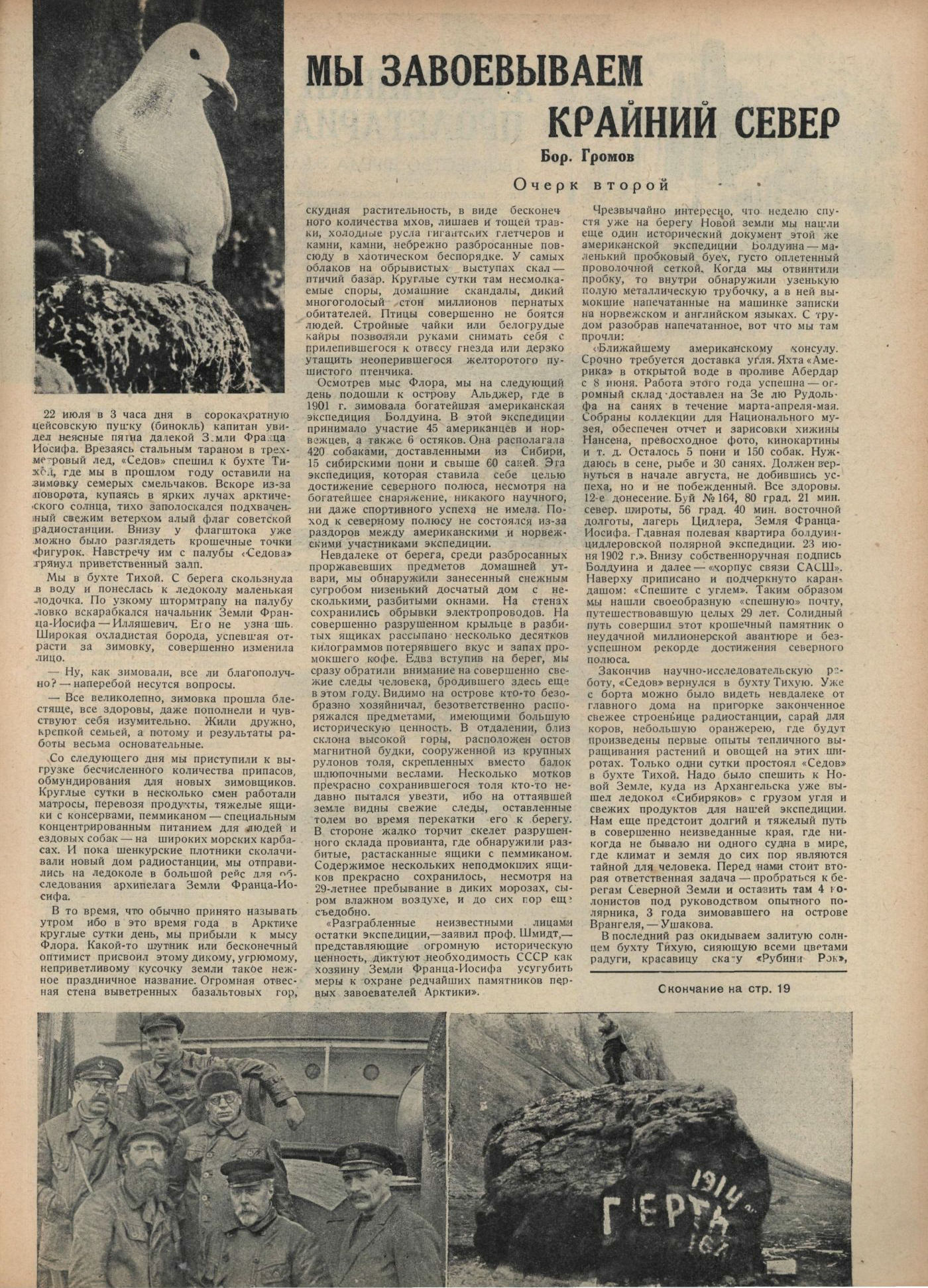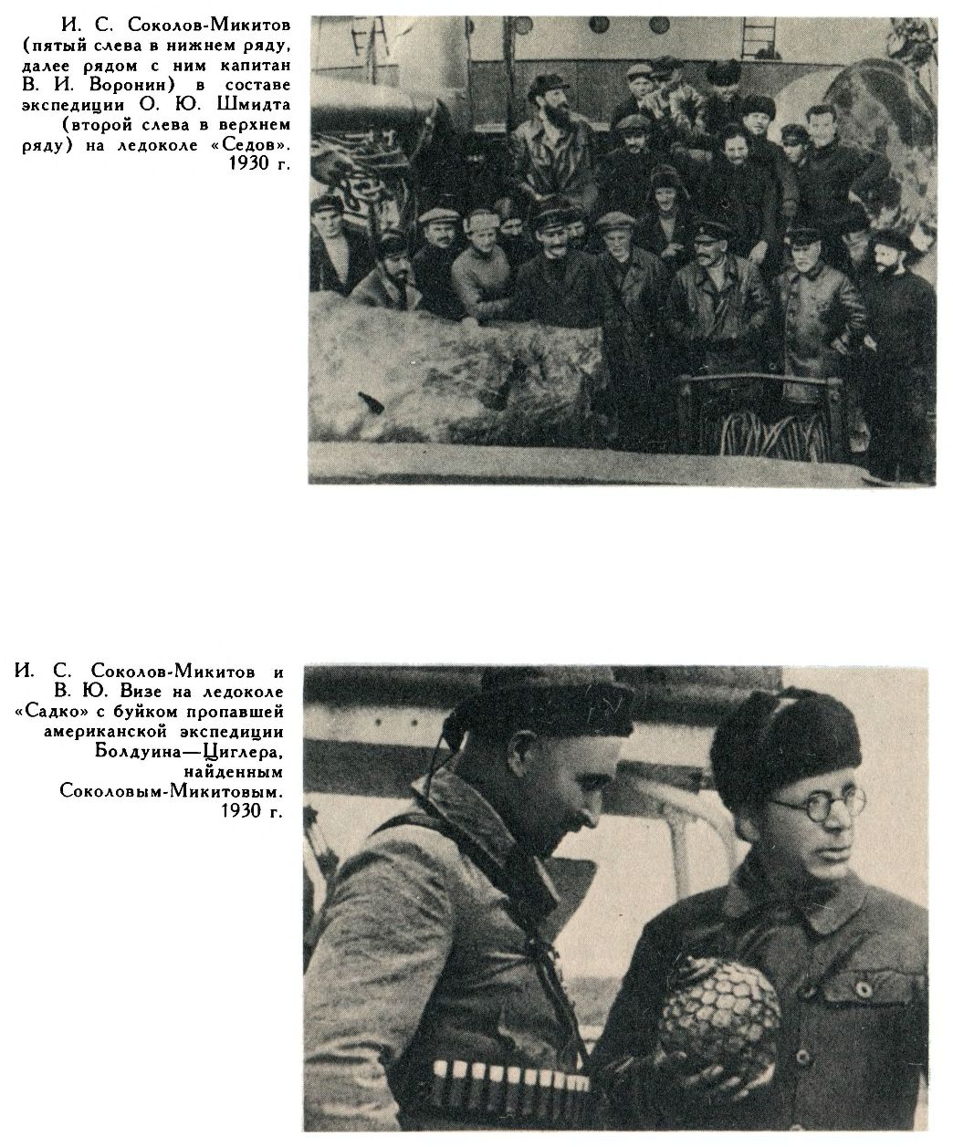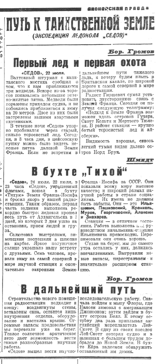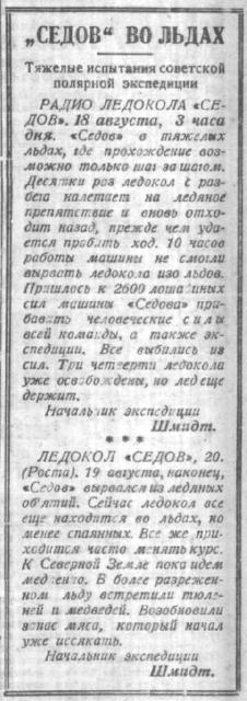 ЛЕДОКОЛ «СЕДОВ», 9. (Радио). Покинув 3 августа Землю Франца Иосифа, удачно пробились сквозь льды и теперь находимся у берега Новой Земли. Наши ученые, воспользовались стоянкой для сбора научных коллекций. Член экспедиции, писатель Соколов-Никитов вернулся из экскурсии с исключительно интересной находкой. Найден выброшенный на снег пробковый буек американской экспедиции Болдуина на Землю Франца Иосифа. В записке Болдуин просит прислать угля для корабля. Эта «спешная» почта шла 28 лет. Начальник экспедиции Шмидт».