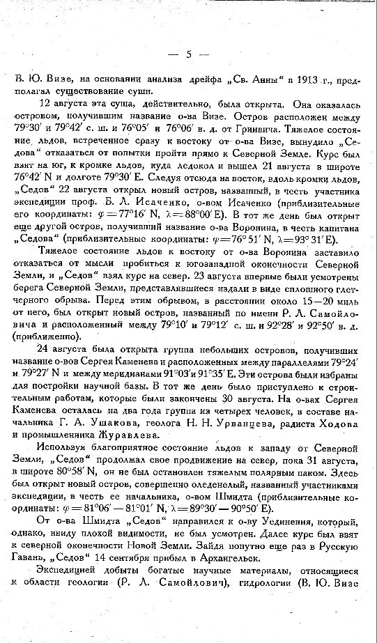 С целью пополнения запасов ух-ля, „Седов" зашел в Русскую Гавань на Новой Земле, куда был заказан л/п „Сибиряков", 2 августа „Седов" вышел из Русской Гавани и взял сперва курс на север, лег затем на восток, с целью, на пути к Северной Земле, пройти через то место, где В.Ю.Визе, на основании анализа дрейфа „Св.Анны" в1913г.,предполагал существование суши.