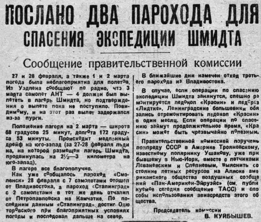 • Правительством принято решение отправить из Ленинграда мощный ледокол «Красин». Начальником экспедиции назначен т. Смирнов П. И., помощником начальника по научной части т. Евгенов Н. И., капитаном корабля — т. Пономарев П. А.