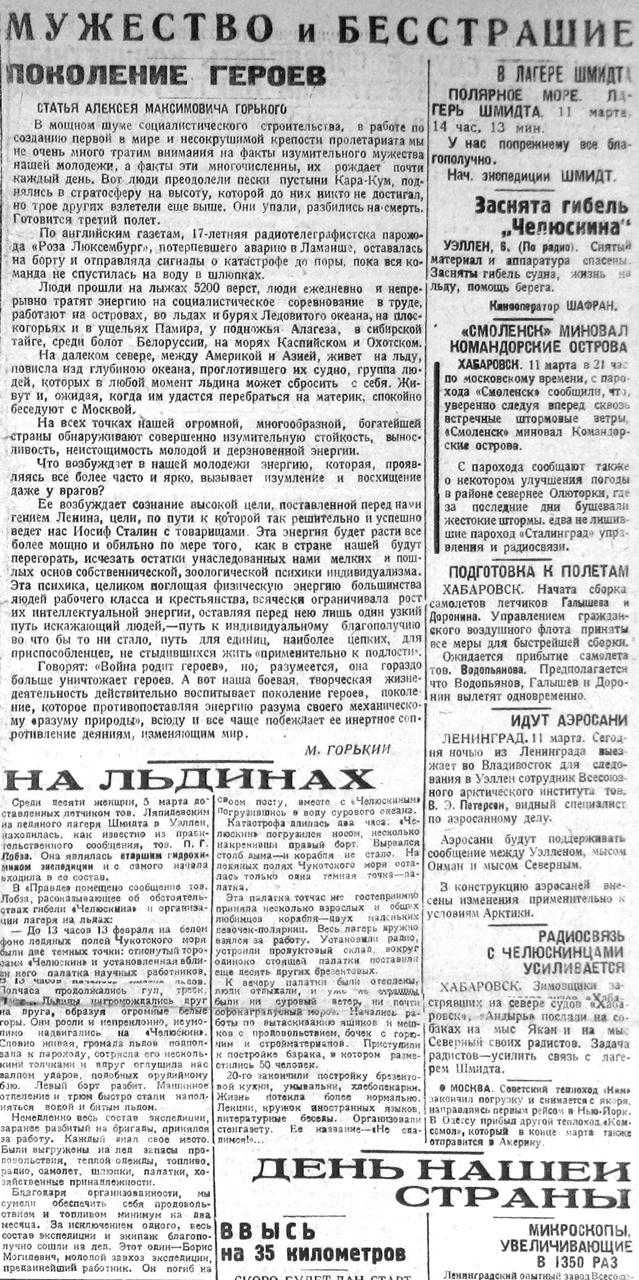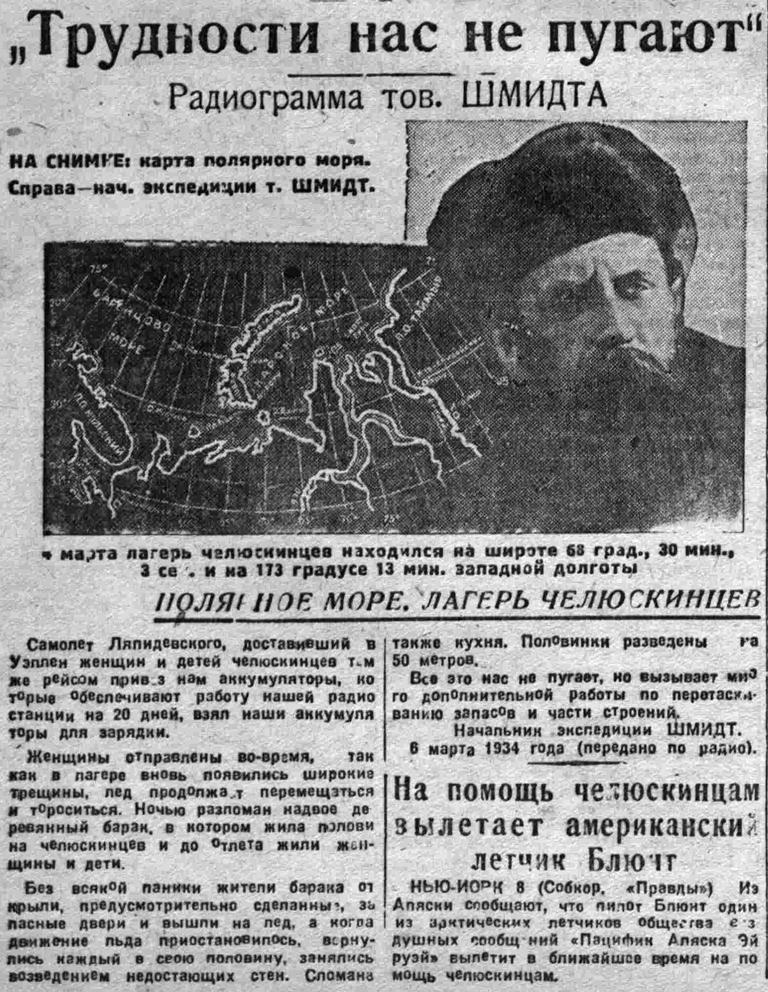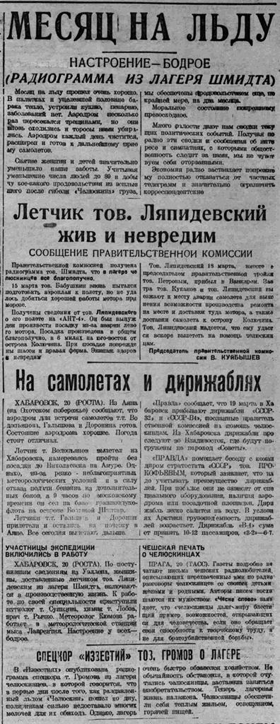Спецкор «Известий» тов. Громов сообщает известия из лагеря Шмидта: «Далеко от берегов своей республики затерялся во льдах Полярного моря маленький лагерь Шмидта. Находясь за тысячи километров от культурных центров страны, мы все же в курсе всех политических новостей и всех хозяйственных достижений Советского союза за. Кренкель установил прекрасную радиосвязь с береговыми станциями и это дает нам возможность ежедневно получать информацию о происходящих событиях. По вечерам, в бараке собираются все челюскинцы и при свете самодельных коптилок с жадностью читают полученные за день сообщения о жизни, делах и победах советской страны. Забывая об окружающей обстановке, челюскинцы до позднего вечера остаются в бараке, обсуждая принесенные Кренкелем новости.