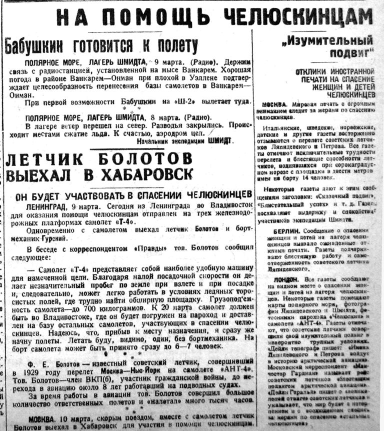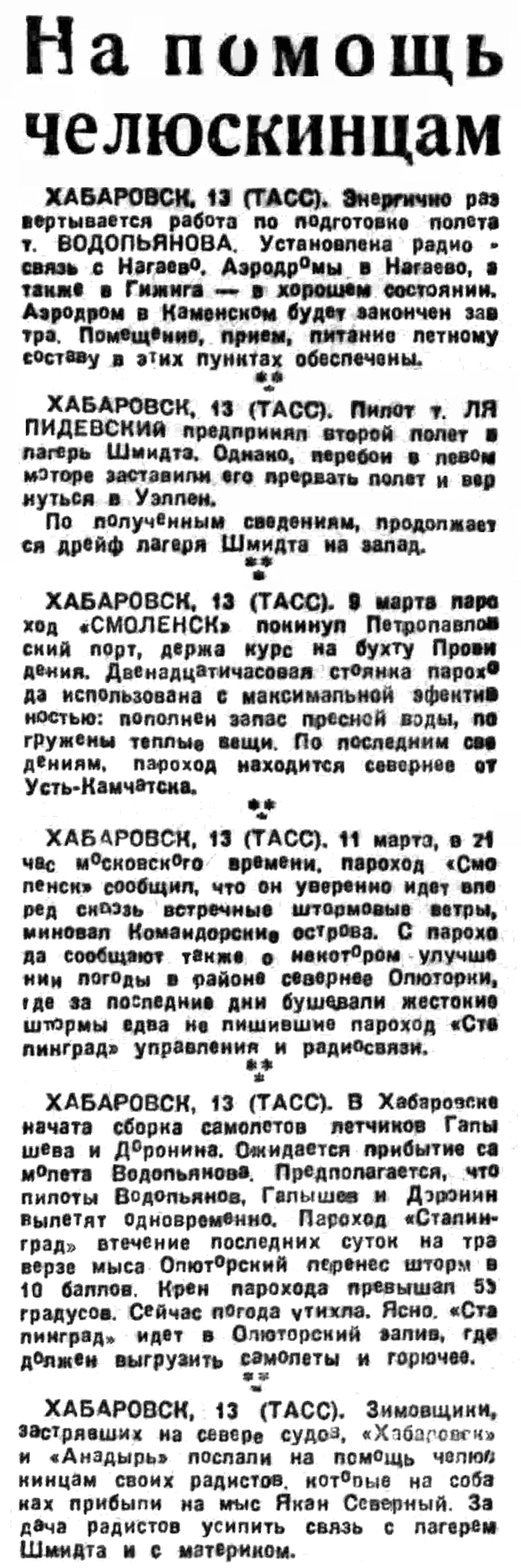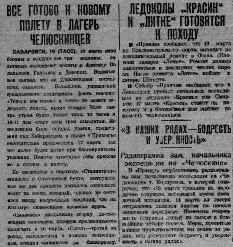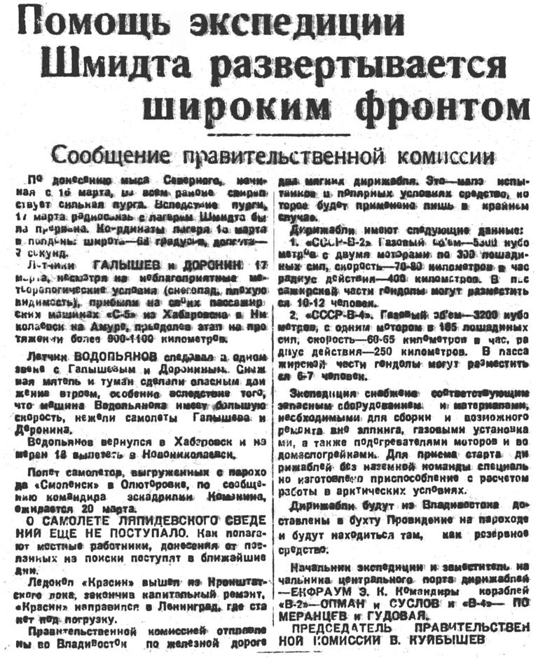 «Правда» сообщает, что 19 марта в Хабаровск прибывают дирижабли «СССР-В-2» и «СССР-В-4», посланные правительственной комиссией на помощь челюскинцам. Из Хабаровска дирижабли про следуют но Владивосток, где будут погружены на пароход «Советы».