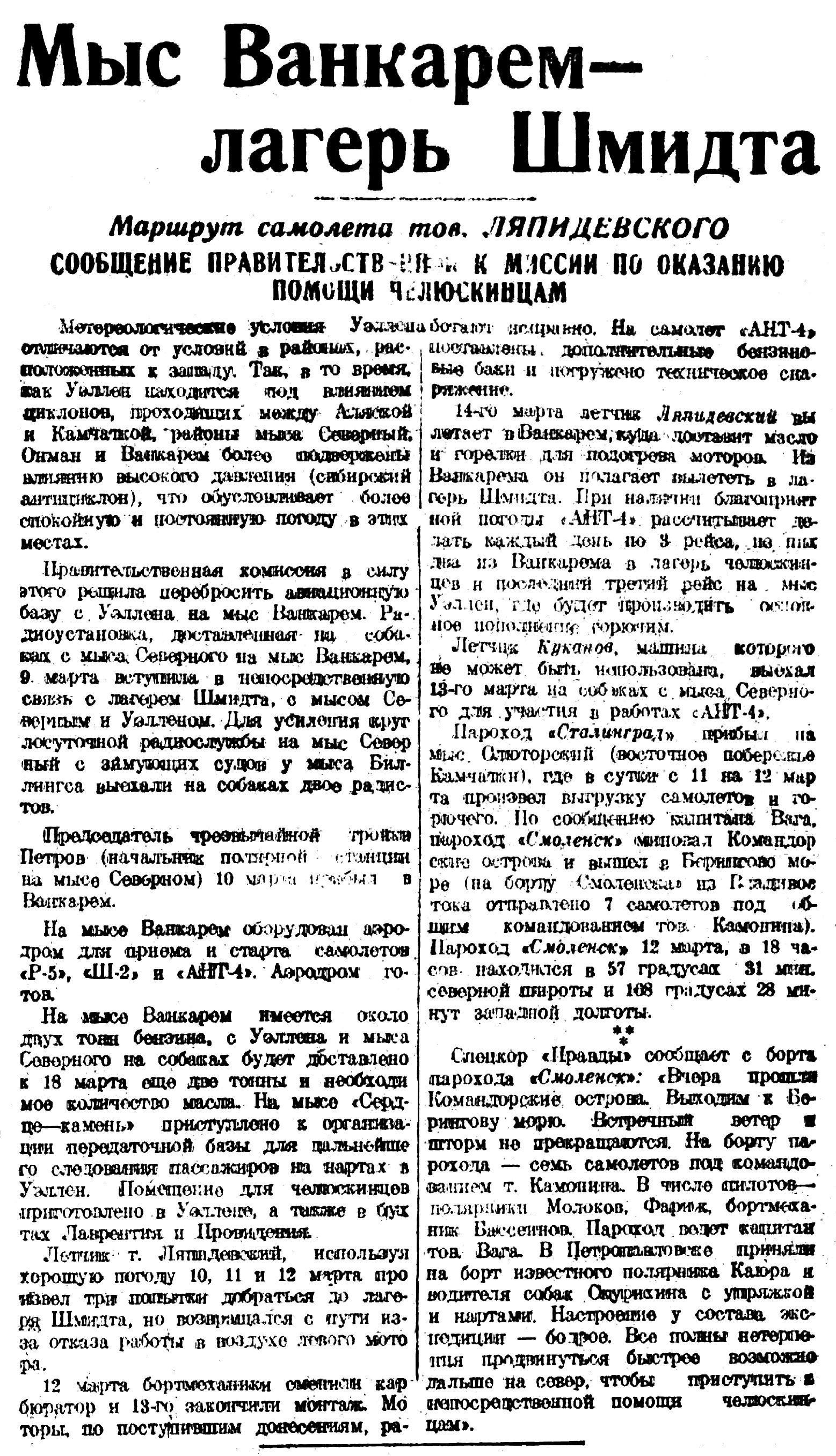 Тов. Ляпидевский 18 марта, вместе с председателем правительственной тройки тов. Петровым, прибыл в Ванкарем. Завтра тов. Куканов и тов. Ляпидевский выезжают к месту аварии самолета для выяснения возможности производства ремонта на месте и доставки туда мотора, а также доставки самолета к острову Колючина. Тов. Ляпидевский надеется, что ему удастся вскоре вылететь на помощь челюскинцам.