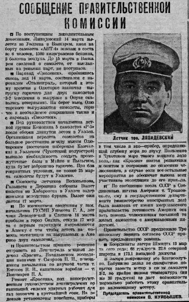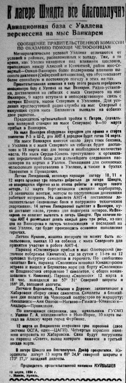 В сообщении от 13 марта указывалось, что летчик Ляпидевский предполагает 14 вылететь в Ванкарем. По поступившим донесениям Ляпидевский вылетел 14-го в 2 ч. 34 мин. по московскому времени из Уэллена в Ванкарем, но в Ванкарем не прибыл. Как сообщает т. Петров, видимо у т. Ляпидевского произошла вынужденная посадка в районе мыса Сердце-Камень. Меры к розыску самолета приняты — посланы нарты.
