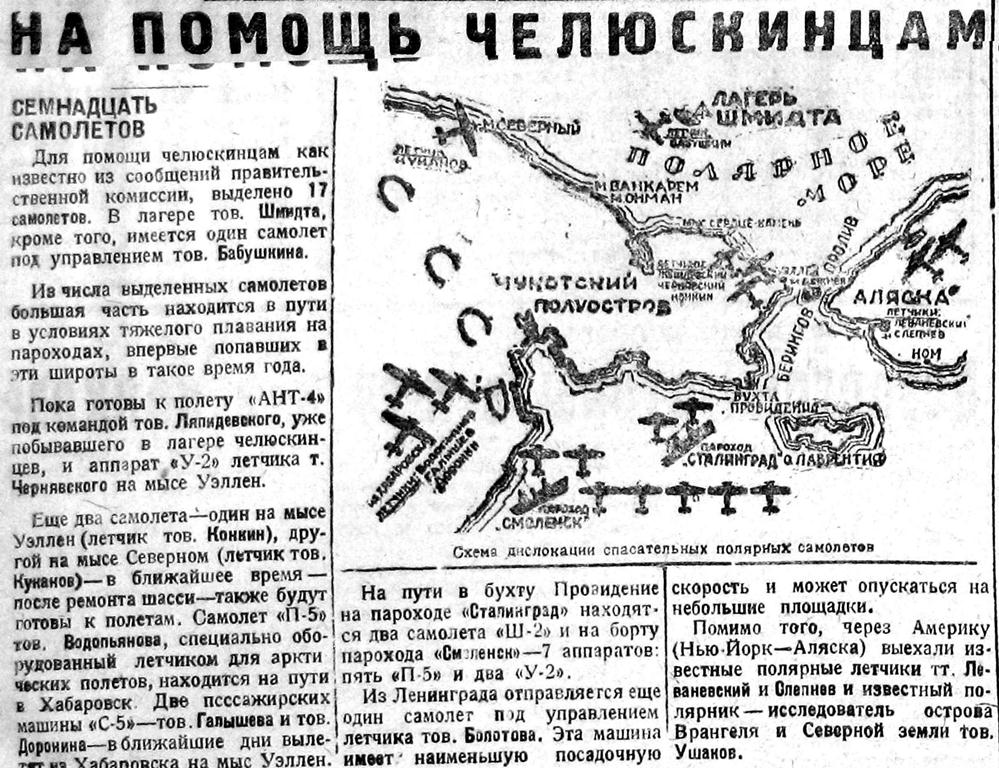 Для помощи челюскинцам выделено 18 САМОЛЕТОВ: «АНТ-4» под командой тов. ЛЯПИДЕВСКОГО, уже побывавшего в лагере тов. Шмидта, аппарат «У-2» летчика т ЧЕРНЯВСКОГО на мысе Уэллен, летчика КОНКИНА (тоже на мысе Уэллен) и летчика КУКАНОВА (на мысе Северном), самолет «П-5» ВОДОПЬЯНОВА, две пассажирских машины «С-5» тт. ГАЛЫШЕВА и ДОРОНИНА. На пароходе «СТАЛИНГРАД» находятся два самолета «Ш-2» и на борту парохода «СМОЛЕНСК» 7 аппаратов — пять «П-5» и два «У-2». Из Ленинграда отправлен еще один самолет под управлением летчика т. БОЛОТОВА. В лагере Шмидта имеется аэроплан летчика тов. БАБУШКИНА.