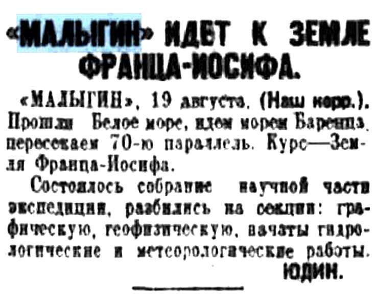 Арктический поход "Малыгина" вызвал за границей огромный интерес. Среди желающих принять участие в походе — знаменитый исследователь Арктики Фредерик Джексон — 72 лет, который еще в 1894 г. был руководителем экспедиции на Землю Франца-Иосифа.