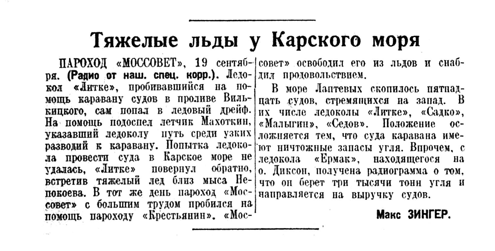 ПАРОХОД «МОССОВЕТ», 19 сентября. (Радио от наш. спец. корр.). Ледокол «Литке», пробивавшийся на помощь каравану судов в проливе Вилькицкого, сам попал в ледовый дрейф. На помощь подоспел летчик Махоткин, указавший ледоколу путь среди узких разводий к каравану. Попытка ледокола провести суда в Карское море не удалась, «Литке» повернул обратно, встретив тяжелый лед близ мыса Неупокоева. В тот же день пароход «Моссовет» с большим трудом пробился на помощь пароходу «Крестьянин». «Моссовет» освободил его из льдов и снабдил продовольствием.