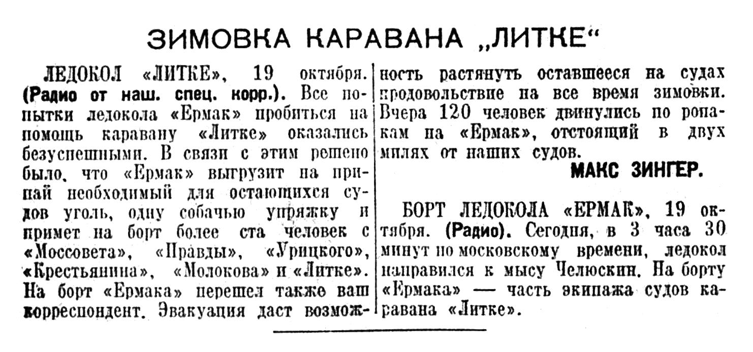 ЛЕДОКОЛ «ЛИТКЕ», 19 октября. (Радио от наш. спец. корр.). Все попытки ледокола «Ермак» пробиться на помощь каравану «Литке» оказались безуспешными. В связи с этим решено было, что «Ермак» выгрузит на припай необходимый для остающихся судов уголь, одну собачью упряжку и примет на борт более ста человек с «Моссовета», «Правды», «Урицкого», «Крестьянина», «Молокова» и «Литке». На борт «Ермака» перешел также ваш корреспондент. Эвакуация даст возможность растянуть оставшееся на судах продовольствие на все время зимовки. Вчера 120 человек двинулись по ропакам на «Ермак», отстоящий в двух милях от наших судов.