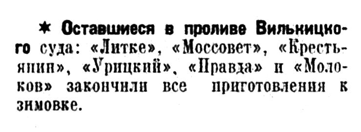 * Оставшиеся в проливе Вилькицкого суда: «Литке», «Моссовет», «Крестьянин», «Урицкий», «Правда» и «Молоков» закончили все приготовления к зимовке.