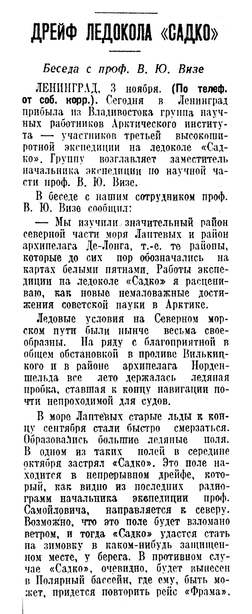 *) Ледоколы «Садко», «Малыгин» и «Седов» зимуют в море Лаптевых. См. «Правду» от 30 ноября.