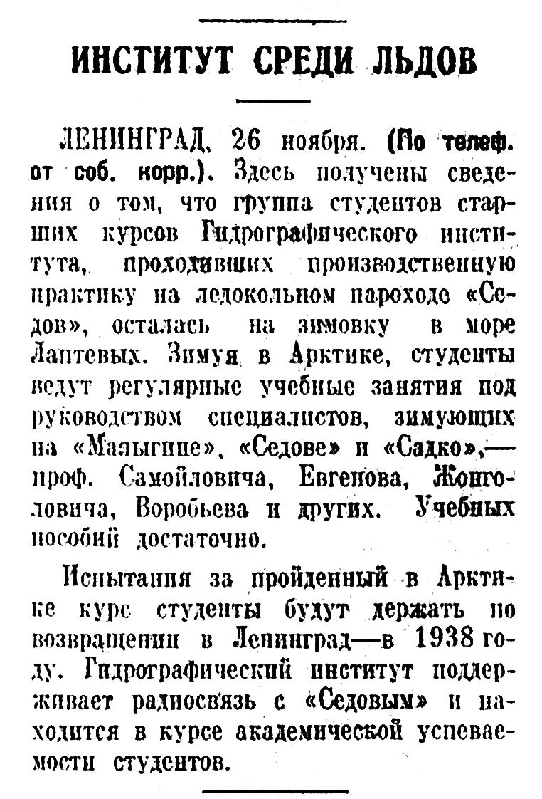 ЛЕНИНГРАД, 26 ноября. (По телеф. от соб. корр.). Здесь получены сведения о том, что группа студентов старших курсов Гидрографического института, проходивших производственную практику на ледокольном пароходе «Седов», осталась на зимовку в море Лаптевых. Зимуя в Арктике, студенты ведут регулярные учебные занятия под руководством специалистов, зимующих на «Малыгине», «Седове» и «Садко», — проф. Самойловича, Евгенова, Жонголовича, Воробьева и других. Учебных пособий достаточно.