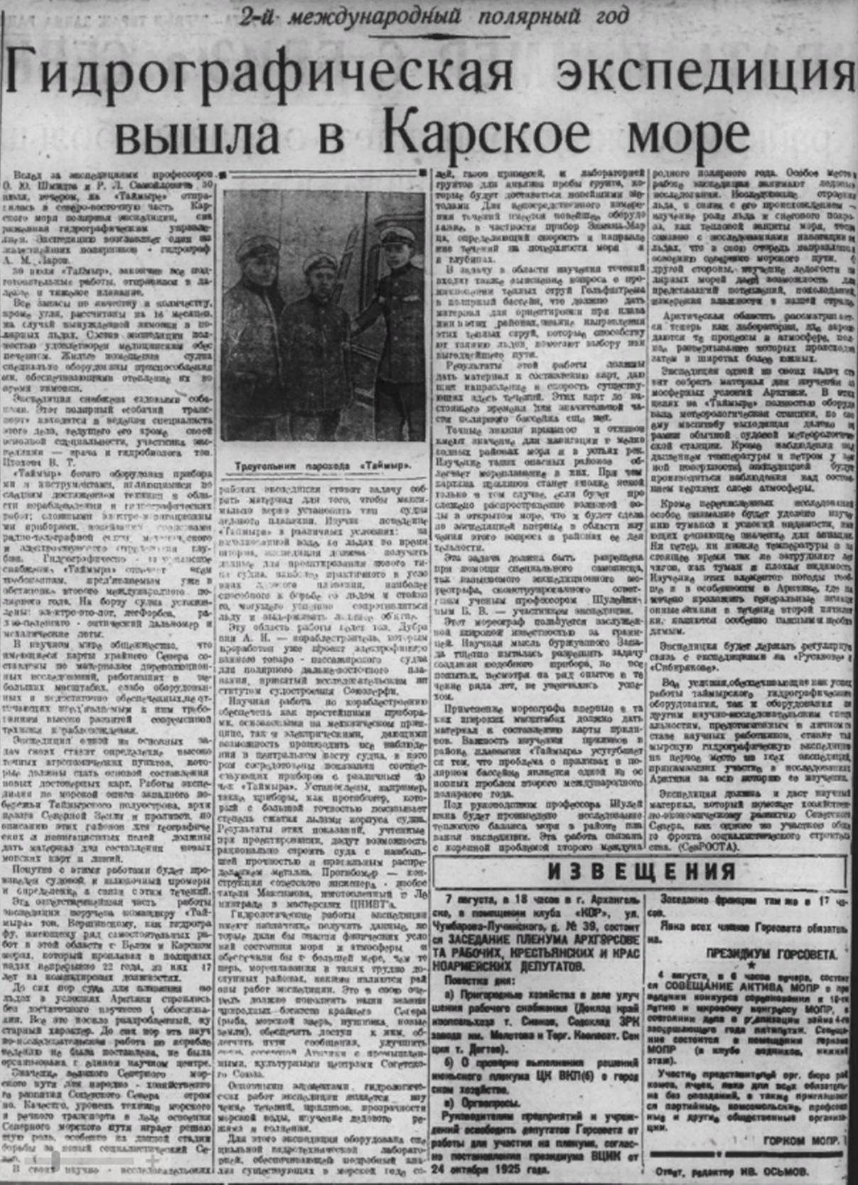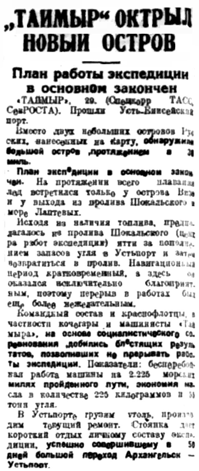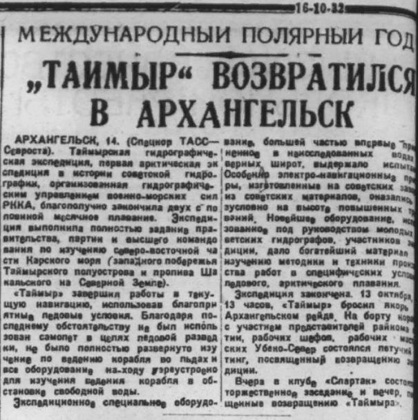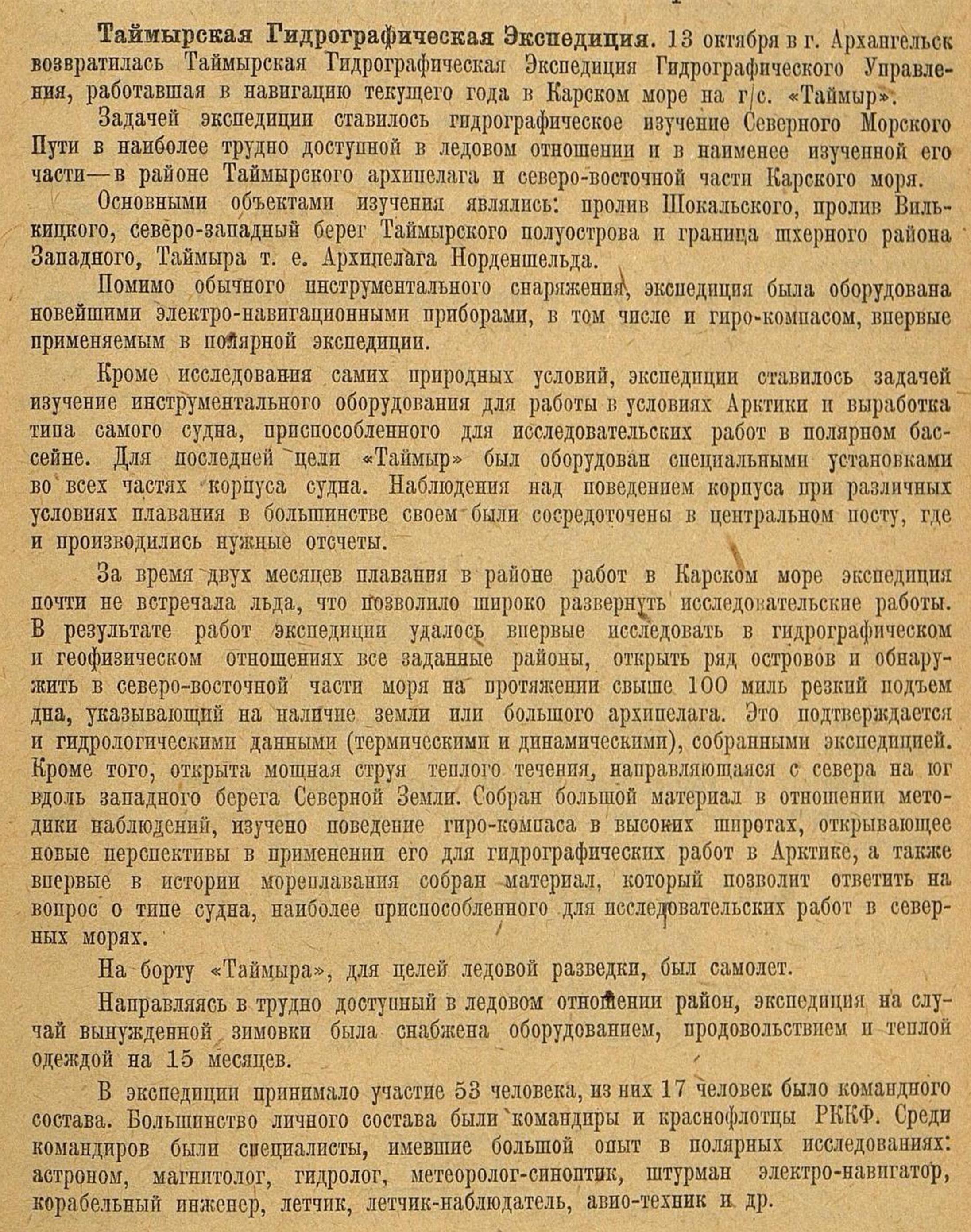 Таймырская Гидрографическая Экспедиция. 13 октября в г. Архангельск возвратилась Таймырская Гидрографическая Экспедиция Гидрографического Управления, работавшая в навигацию текущего года в Карском море на г/с. «Таймыр».