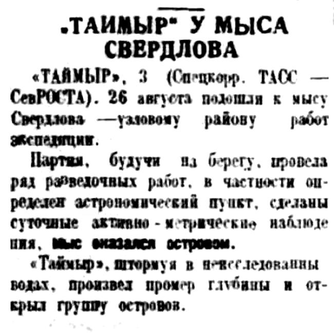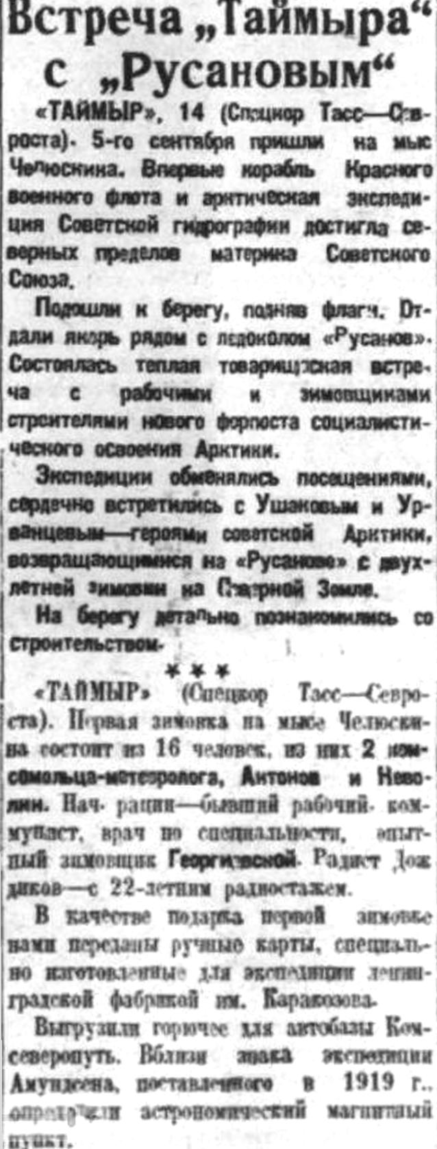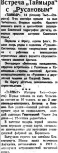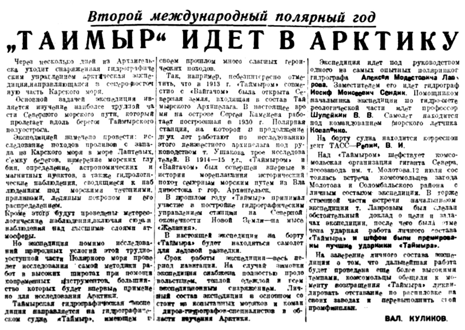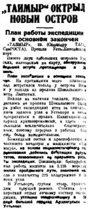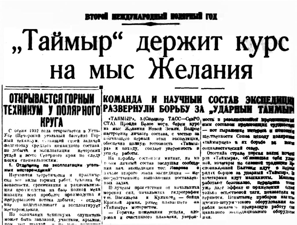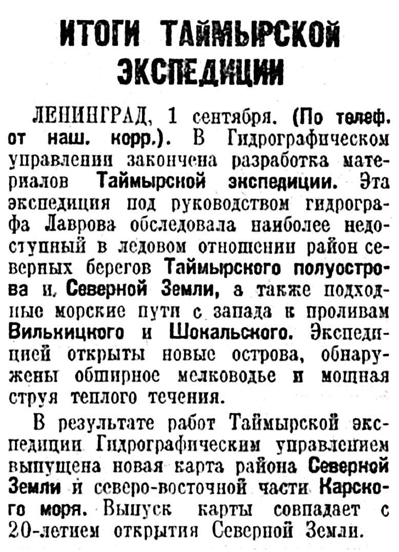Таймырская Гидрографическая Экспедиция. 13 октября в г. Архангельск возвратилась Таймырская Гидрографическая Экспедиция Гидрографического Управления, работавшая в навигацию текущего года в Карском море на г/с. «Таймыр».